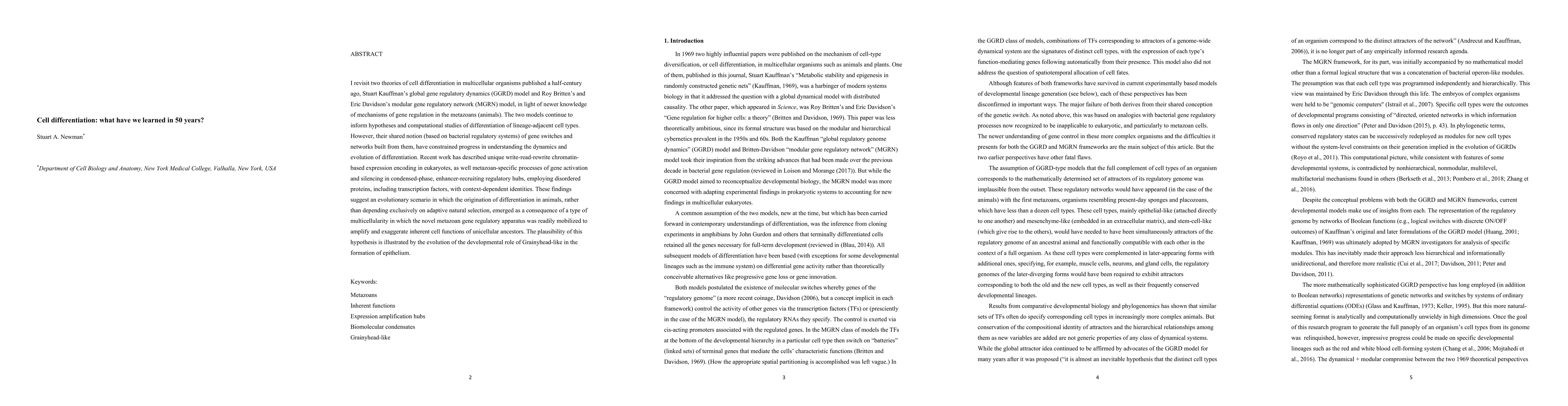 I revisit two theories of cell differentiation in multicellular organisms published a half-century ago, Stuart Kauffman's global gene regulatory dynamics (GGRD) model and Roy Britten's and Eric Davidson's modular gene regulatory network (MGRN) model, in light of newer knowledge of mechanisms of gene regulation in the metazoans (animals). The two models continue to inform hypotheses and computational studies of differentiation of lineage-adjacent cell types. However, their shared notion (based on bacterial regulatory systems) of gene switches and networks built from them, have constrained progress in understanding the dynamics and evolution of differentiation. Recent work has described unique write-read-rewrite chromatin-based expression encoding in eukaryotes, as well metazoan-specific processes of gene activation and silencing in condensed-phase, enhancer-recruiting regulatory hubs, employing disordered proteins, including transcription factors, with context-dependent identities. These findings suggest an evolutionary scenario in which the origination of differentiation in animals, rather than depending exclusively on adaptive natural selection, emerged as a consequence of a type of multicellularity in which the novel metazoan gene regulatory apparatus was readily mobilized to amplify and exaggerate inherent cell functions of unicellular ancestors. The plausibility of this hypothesis is illustrated by the evolution of the developmental role of Grainyhead-like in the formation of epithelium.