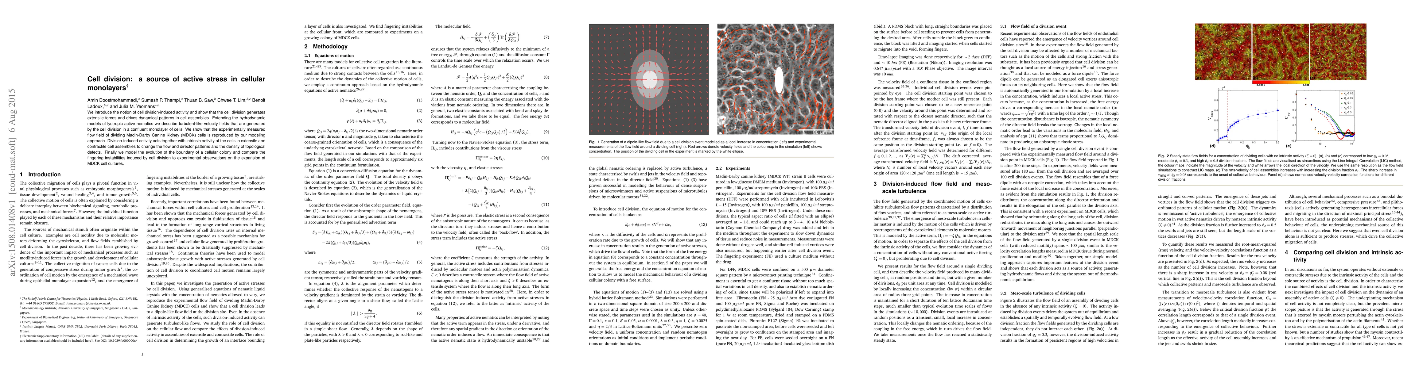 This paper explores how cell division generates extensile forces and dynamic patterns in cellular monolayers, modeling the turbulent-like velocity fields produced by dividing cells. The study demonstrates the experimental and modeling correlation in the flow field of dividing Madin-Darby Canine Kidney (MDCK) cells, highlighting the impact of division-induced activity on cell assembly flow and defect density patterns.