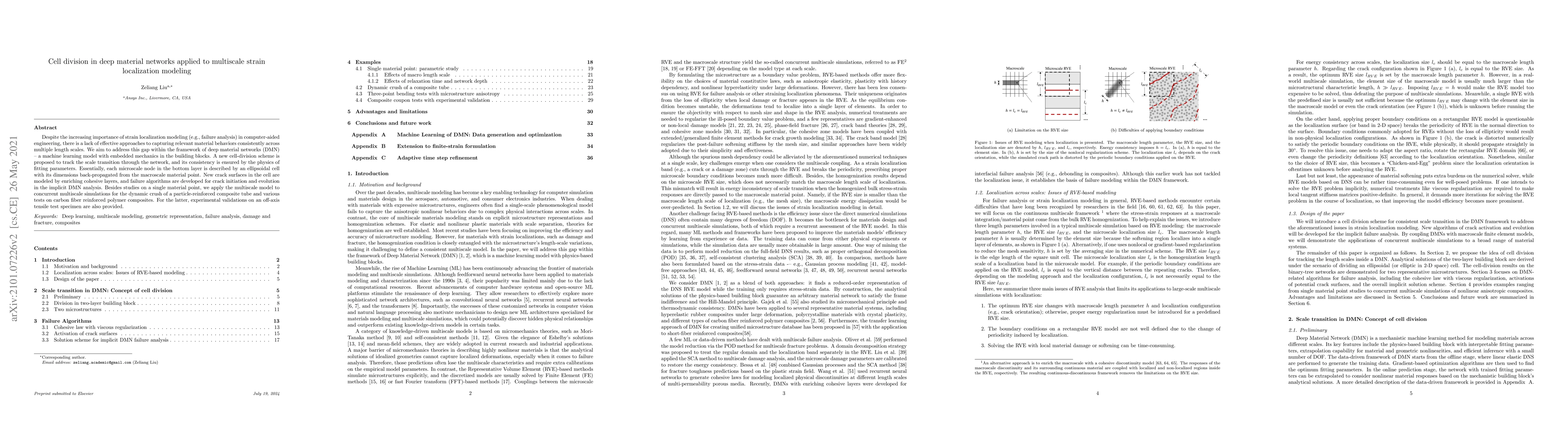 This paper proposes a cell-division scheme within deep material networks (DMN) to model multiscale strain localization, ensuring consistency through physics-based fitting parameters. The method is validated through simulations of composite materials and experimental tests on carbon fiber reinforced polymer composites.