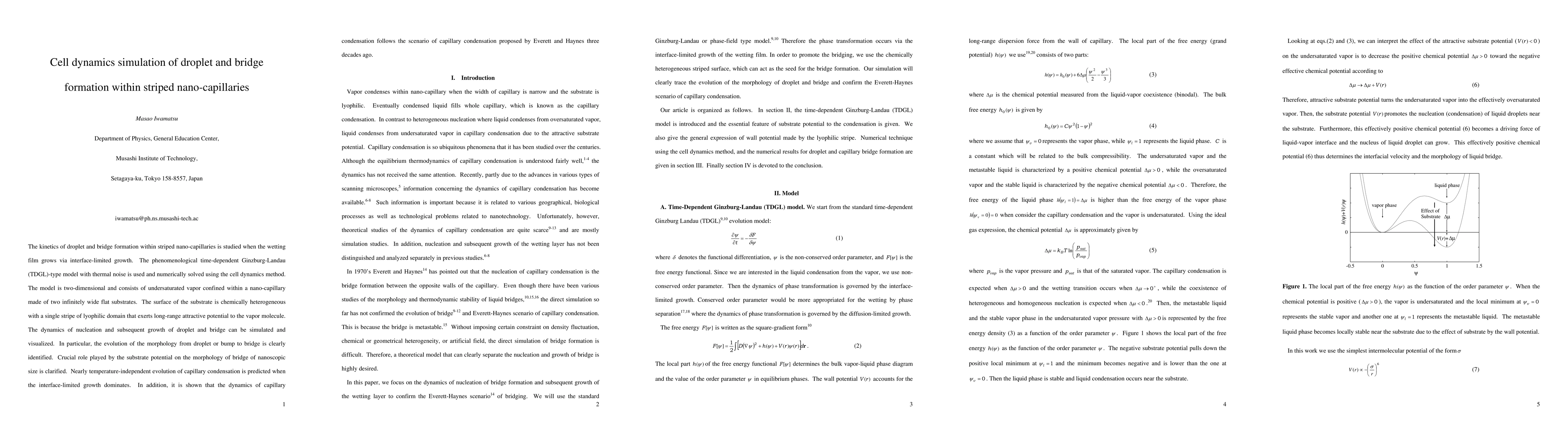 This paper uses a cell dynamics simulation to study droplet and bridge formation in striped nano-capillaries under interface-limited growth conditions, revealing the impact of substrate potential on nanoscopic bridge morphology and confirming the nearly temperature-independent evolution of capillary condensation.