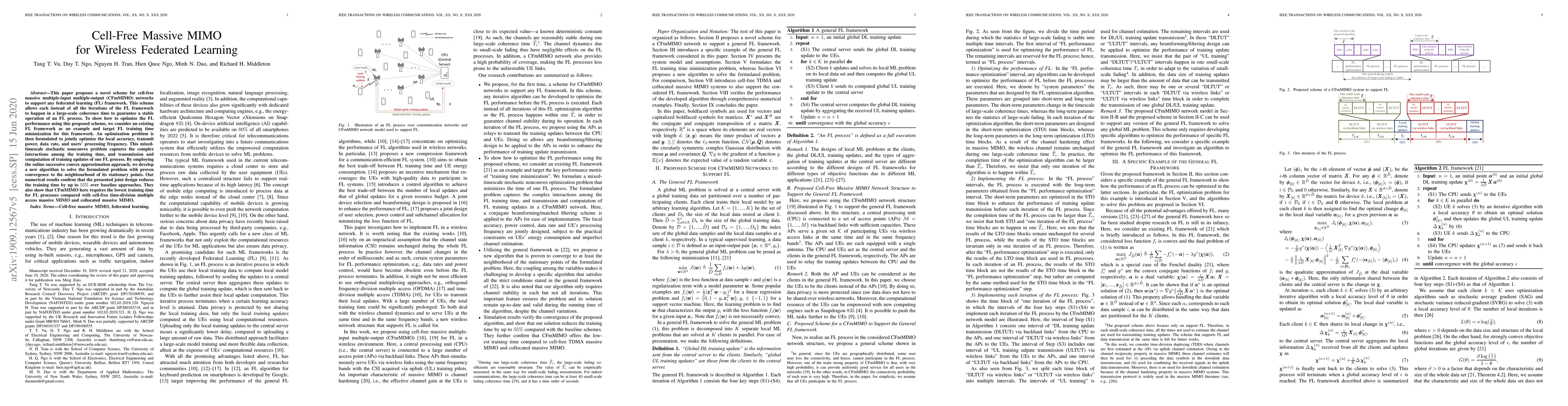 This paper proposes a novel scheme for cell-free massive multiple-input multiple-output (CFmMIMO) networks to support any federated learning (FL) framework. This scheme allows each instead of all the iterations of the FL framework to happen in a large-scale coherence time to guarantee a stable operation of an FL process. To show how to optimize the FL performance using this proposed scheme, we consider an existing FL framework as an example and target FL training time minimization for this framework. An optimization problem is then formulated to jointly optimize the local accuracy, transmit power, data rate, and users' processing frequency. This mixed-timescale stochastic nonconvex problem captures the complex interactions among the training time, and transmission and computation of training updates of one FL process. By employing the online successive convex approximation approach, we develop a new algorithm to solve the formulated problem with proven convergence to the neighbourhood of its stationary points. Our numerical results confirm that the presented joint design reduces the training time by up to $55\%$ over baseline approaches. They also show that CFmMIMO here requires the lowest training time for FL processes compared with cell-free time-division multiple access massive MIMO and collocated massive MIMO.
