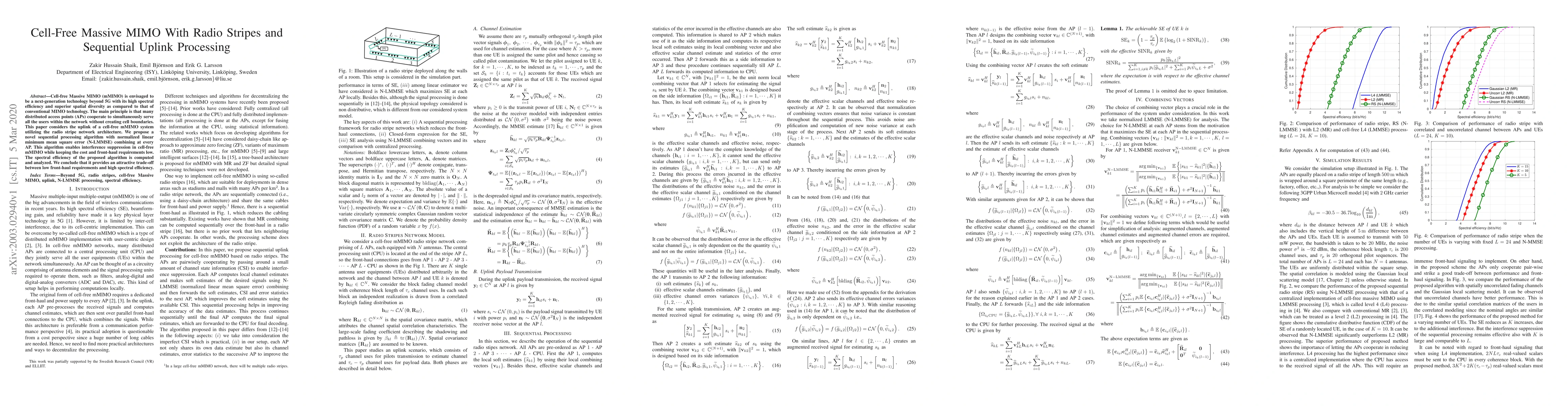 This paper proposes a novel sequential uplink processing algorithm for cell-free Massive MIMO systems using radio stripe architecture, featuring normalized linear minimum mean square error combining to achieve low front-haul requirements while maintaining high spectral efficiency. The algorithm demonstrates an attractive balance between interference suppression and cost efficiency.