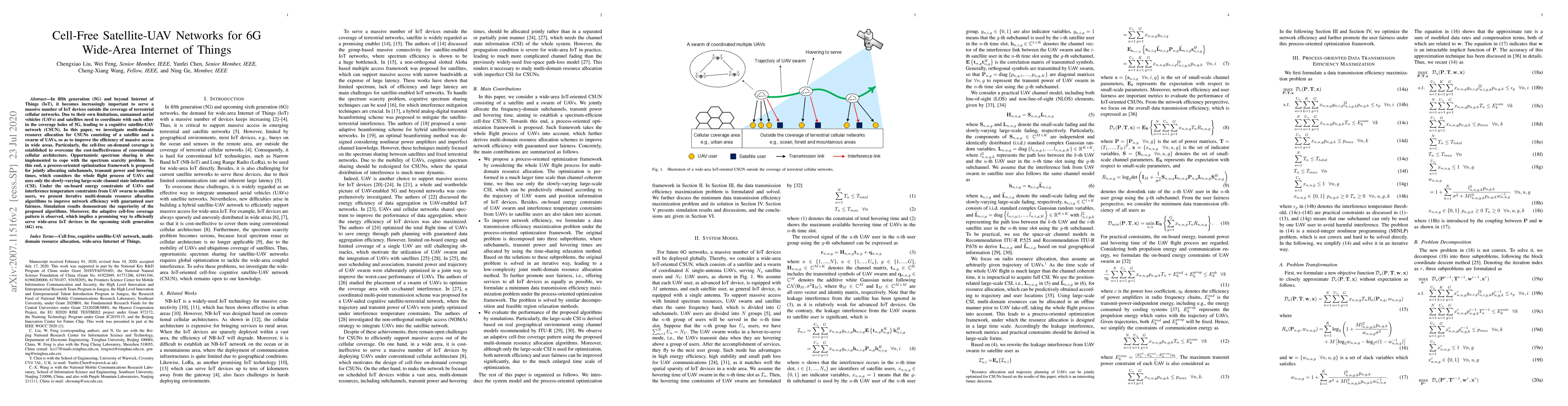 In fifth generation (5G) and beyond Internet of Things (IoT), it becomes increasingly important to serve a massive number of IoT devices outside the coverage of terrestrial cellular networks. Due to their own limitations, unmanned aerial vehicles (UAVs) and satellites need to coordinate with each other in the coverage holes of 5G, leading to a cognitive satellite-UAV network (CSUN). In this paper, we investigate multi-domain resource allocation for CSUNs consisting of a satellite and a swarm of UAVs, so as to improve the efficiency of massive access in wide areas. Particularly, the cell-free on-demand coverage is established to overcome the cost-ineffectiveness of conventional cellular architecture. Opportunistic spectrum sharing is also implemented to cope with the spectrum scarcity problem. To this end, a process-oriented optimization framework is proposed for jointly allocating subchannels, transmit power and hovering times, which considers the whole flight process of UAVs and uses only the slowly-varying large-scale channel state information (CSI). Under the on-board energy constraints of UAVs and interference temperature constraints from UAV swarm to satellite users, we present iterative multi-domain resource allocation algorithms to improve network efficiency with guaranteed user fairness. Simulation results demonstrate the superiority of the proposed algorithms. Moreover, the adaptive cell-free coverage pattern is observed, which implies a promising way to efficiently serve wide-area IoT devices in the upcoming sixth generation (6G) era.