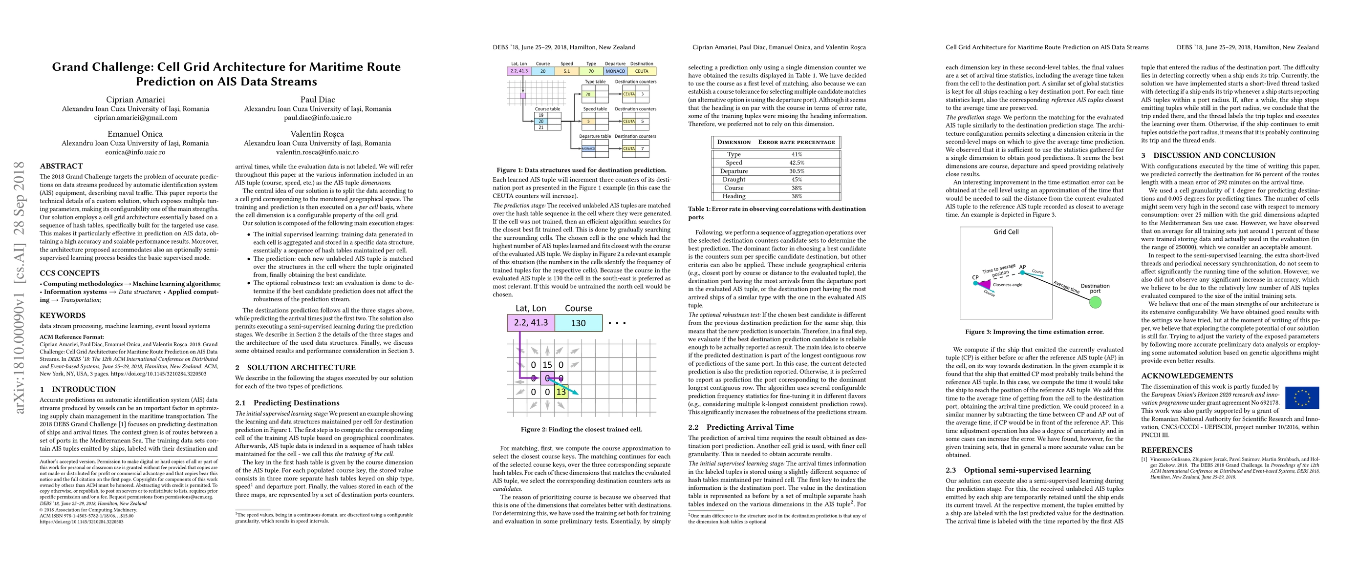 The 2018 Grand Challenge targets the problem of accurate predictions on data streams produced by automatic identification system (AIS) equipment, describing naval traffic. This paper reports the technical details of a custom solution, which exposes multiple tuning parameters, making its configurability one of the main strengths. Our solution employs a cell grid architecture essentially based on a sequence of hash tables, specifically built for the targeted use case. This makes it particularly effective in prediction on AIS data, obtaining a high accuracy and scalable performance results. Moreover, the architecture proposed accommodates also an optionally semi-supervised learning process besides the basic supervised mode.