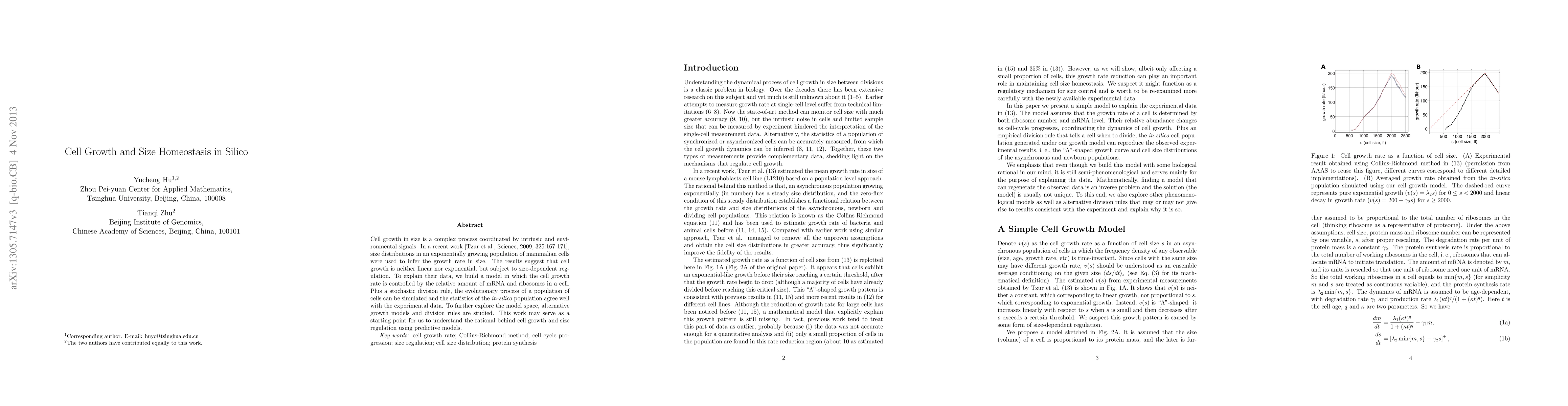 This paper develops a computational model to simulate cell growth and size homeostasis, showing that cell growth is regulated by the balance of mRNA and ribosomes. The model's predictions align well with experimental data, suggesting a size-dependent growth regulation and providing insights into cellular growth mechanisms.