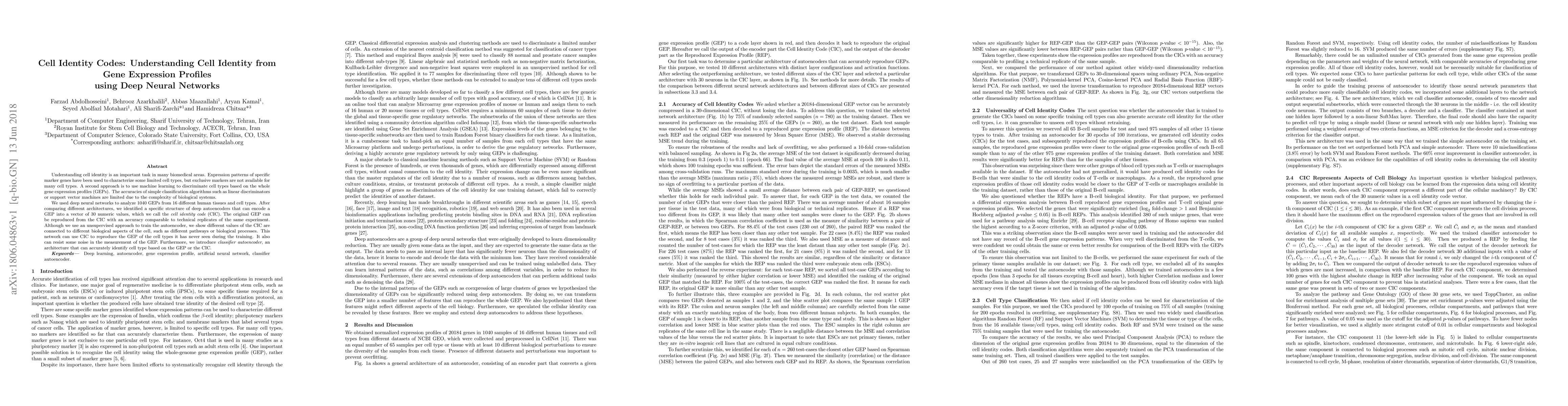 This paper explores the use of deep neural networks, specifically deep autoencoders, to encode gene expression profiles into cell identity codes (CIC) that can accurately represent and reproduce cell types from complex human tissue data. The proposed method can identify cell types even when trained on limited data and can handle noise in gene expression measurements.