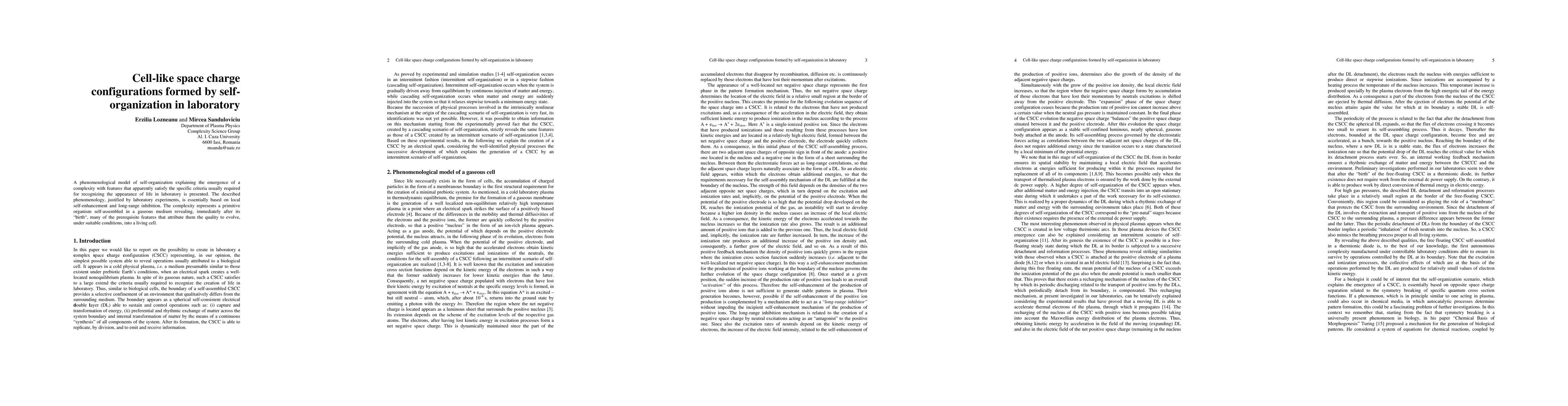 A phenomenological model of self-organization explaining the emergence of a complexity with features that apparently satisfy the specific criteria usually required for recognizing the appearance of life in laboratory is presented. The described phenomenology, justified by laboratory experiments, is essentially based on local self-enhancement and long-range inhibition. The complexity represents a primitive organism self-assembled in a gaseous medium revealing, immediately after its "birth", many of the prerequisite features that attribute them the quality to evolve, under suitable conditions, into a living cell.