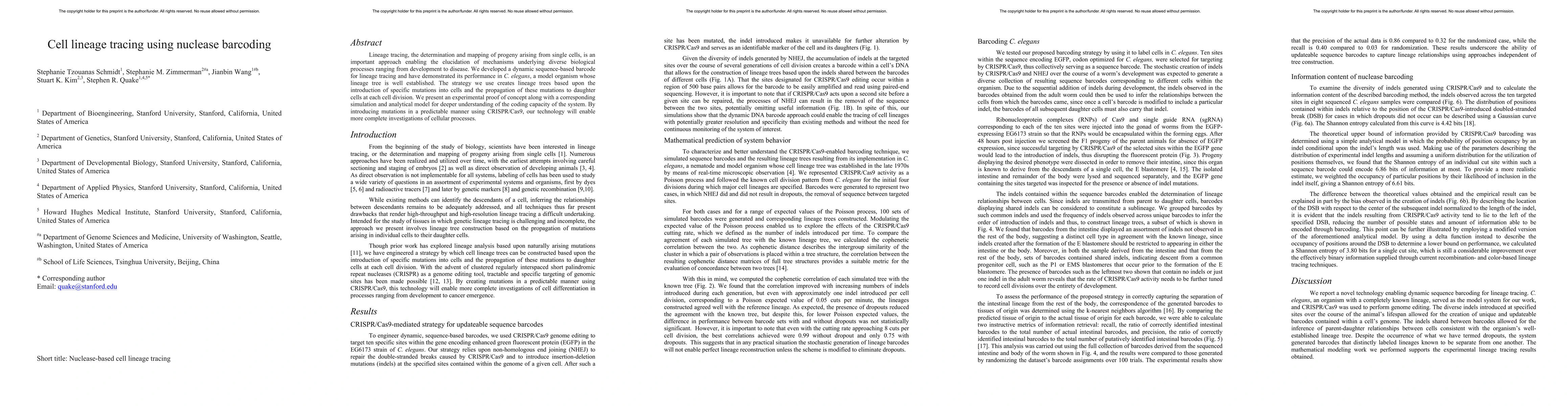 This paper introduces a novel nuclease barcoding method for lineage tracing in C. elegans, utilizing CRISPR/Cas9-induced mutations to create dynamic sequence-based barcodes that track cell lineages. The method's effectiveness is demonstrated experimentally and supported by simulations and analytical models, promising enhanced insights into cellular processes.