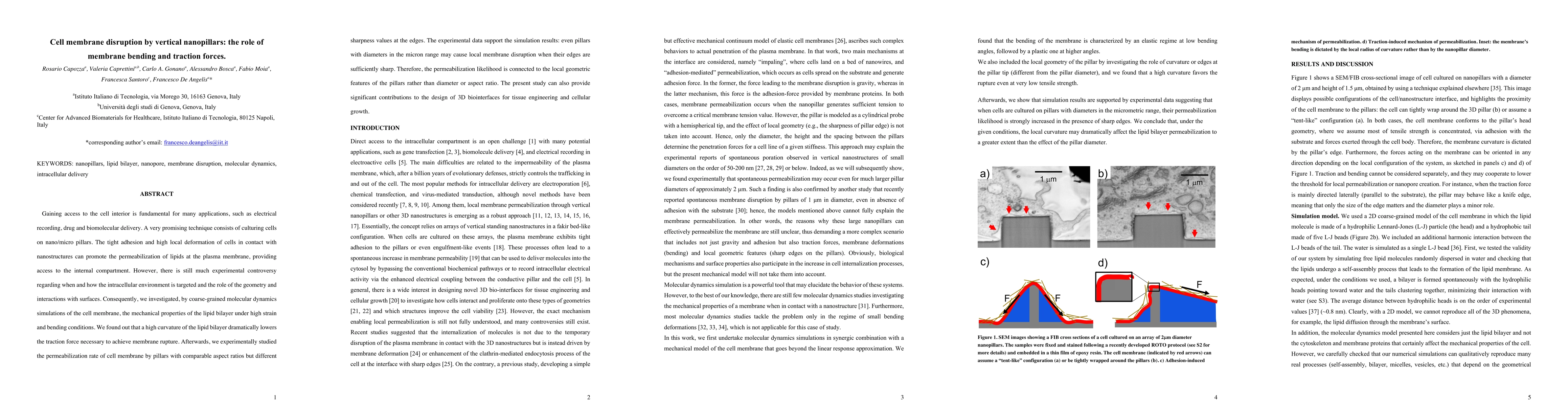 This research investigates how vertical nanopillars disrupt cell membranes, finding that membrane bending and traction forces significantly influence rupture. Simulations and experiments reveal that sharp edges on nanopillars, regardless of size, can cause membrane disruption, emphasizing the importance of pillar geometry over size for effective permeabilization.