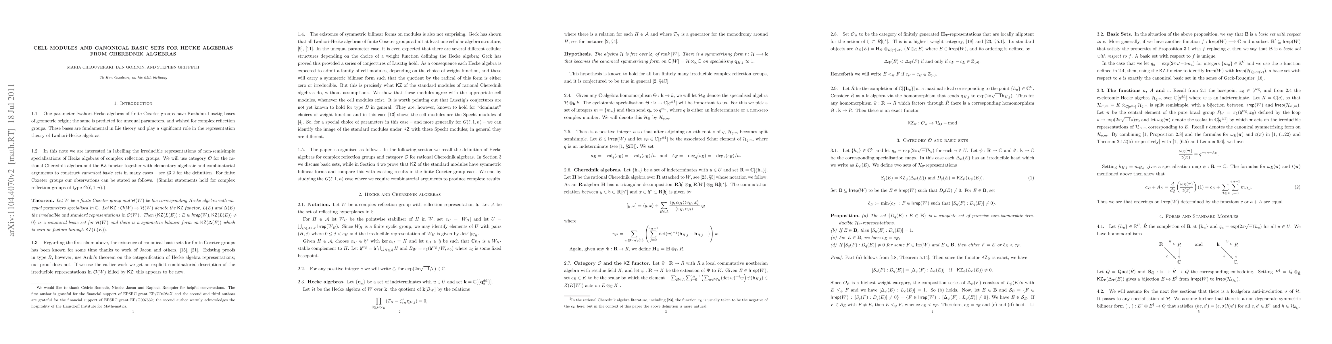 In this note we are interested in labelling the irreducible representations of non-semisimple specialisations of Hecke algebras of complex reflection groups. We will use category O for the rational Cherednik algebra and the KZ functor together with elementary algebraic and combinatorial arguments to construct "canonical basic sets" in many cases. We will also show that the images of the standard modules through the KZ functor agree with the appropriate cell modules, whenever the Hecke algebra has a cellular structure.