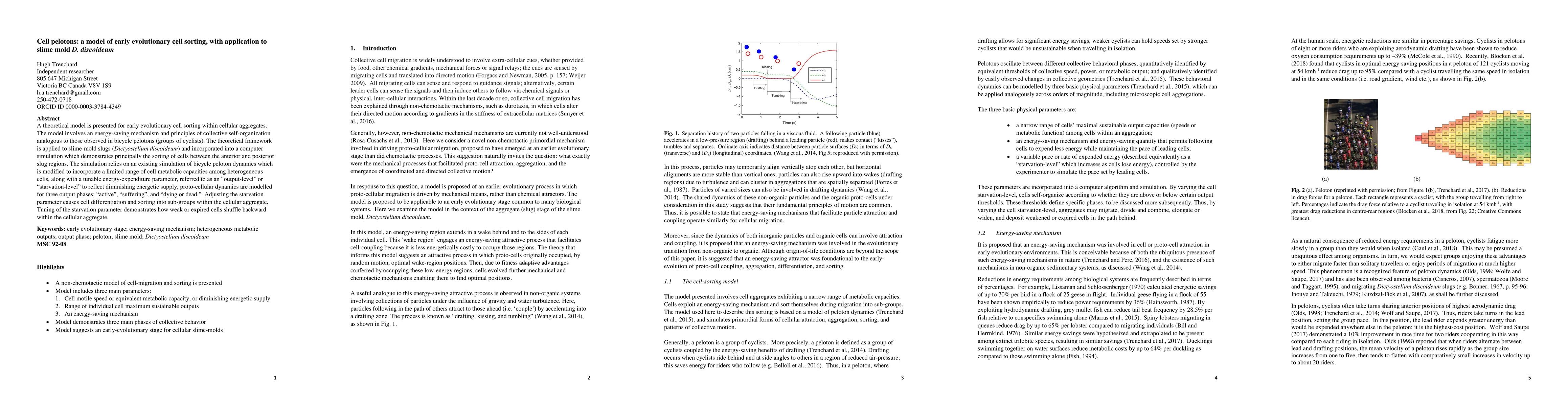 A theoretical model is presented for early evolutionary cell sorting within cellular aggregates. The model involves an energy-saving mechanism and principles of collective self-organization analogous to those observed in bicycle pelotons (groups of cyclists). The theoretical framework is applied to slime-mold slugs (Dictyostelium discoideum) and incorporated into a computer simulation which demonstrates principally the sorting of cells between the anterior and posterior slug regions. The simulation relies on an existing simulation of bicycle peloton dynamics which is modified to incorporate a limited range of cell metabolic capacities among heterogeneous cells, along with a tunable energy-expenditure parameter, referred to as an 'output-level' or 'starvation-level' to reflect diminishing energetic supply, proto-cellular dynamics are modelled for three output phases: 'active', 'suffering', and 'dying or dead.' Adjusting the starvation parameter causes cell differentiation and sorting into sub-groups within the cellular aggregate. Tuning of the starvation parameter demonstrates how weak or expired cells shuffle backward within the cellular aggregate.