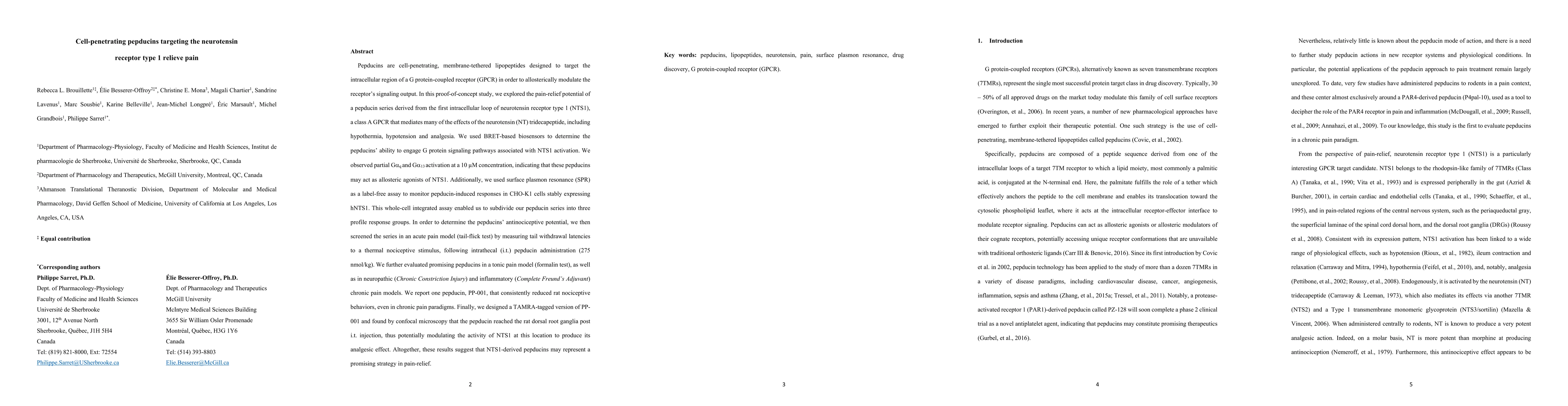 Pepducins are cell-penetrating, membrane-tethered lipopeptides designed to target the intracellular region of a G protein-coupled receptor (GPCR) in order to allosterically modulate the receptor's signaling output. In this proof-of-concept study, we explored the pain-relief potential of a pepducin series derived from the first intracellular loop of neurotensin receptor type 1 (NTS1), a class A GPCR that mediates many of the effects of the neurotensin (NT) tridecapeptide, including hypothermia, hypotension and analgesia. We used BRET-based biosensors to determine the pepducins' ability to engage G protein signaling pathways associated with NTS1 activation. We observed partial Gq and G13 activation at a 10 {\mu}M concentration, indicating that these pepducins may act as allosteric agonists of NTS1. Additionally, we used surface plasmon resonance (SPR) as a label-free assay to monitor pepducin-induced responses in CHO-K1 cells stably expressing hNTS1. This whole-cell integrated assay enabled us to subdivide our pepducin series into three profile response groups. In order to determine the pepducins' antinociceptive potential, we then screened the series in an acute pain model (tail-flick test) by measuring tail withdrawal latencies to a thermal nociceptive stimulus, following intrathecal pepducin administration (275 nmol/kg). We further evaluated promising pepducins in a tonic pain model (formalin test), as well as in neuropathic (Chronic Constriction Injury) and inflammatory (Complete Freund's Adjuvant) chronic pain models. We report one pepducin, PP-001, that consistently reduced rat nociceptive behaviors, even in chronic pain paradigm. Altogether, these results suggest that NTS1-derived pepducins may represent a promising strategy in pain-relief.