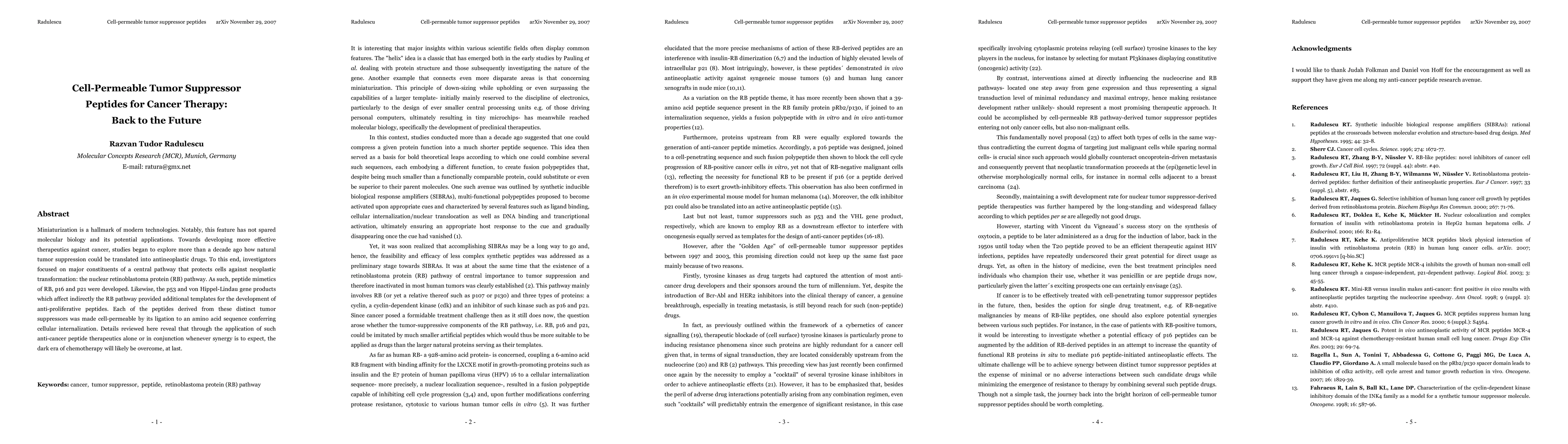 This paper reviews the development of cell-permeable tumor suppressor peptides, derived from the RB, p16, p21, p53, and von Hippel-Lindau pathways, as potential anti-cancer therapeutics. The authors argue that these peptides, when used alone or in combination, may offer a promising alternative to traditional chemotherapy.