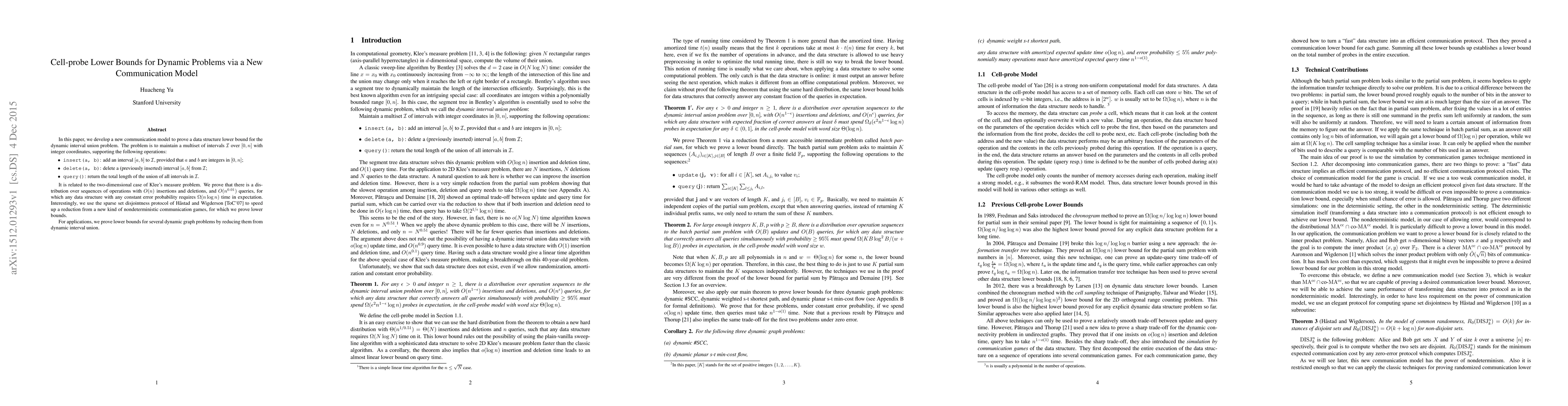 In this paper, we develop a new communication model to prove a data structure lower bound for the dynamic interval union problem. The problem is to maintain a multiset of intervals $\mathcal{I}$ over $[0, n]$ with integer coordinates, supporting the following operations: - insert(a, b): add an interval $[a, b]$ to $\mathcal{I}$, provided that $a$ and $b$ are integers in $[0, n]$; - delete(a, b): delete a (previously inserted) interval $[a, b]$ from $\mathcal{I}$; - query(): return the total length of the union of all intervals in $\mathcal{I}$. It is related to the two-dimensional case of Klee's measure problem. We prove that there is a distribution over sequences of operations with $O(n)$ insertions and deletions, and $O(n^{0.01})$ queries, for which any data structure with any constant error probability requires $\Omega(n\log n)$ time in expectation. Interestingly, we use the sparse set disjointness protocol of H\aa{}stad and Wigderson [ToC'07] to speed up a reduction from a new kind of nondeterministic communication games, for which we prove lower bounds. For applications, we prove lower bounds for several dynamic graph problems by reducing them from dynamic interval union.