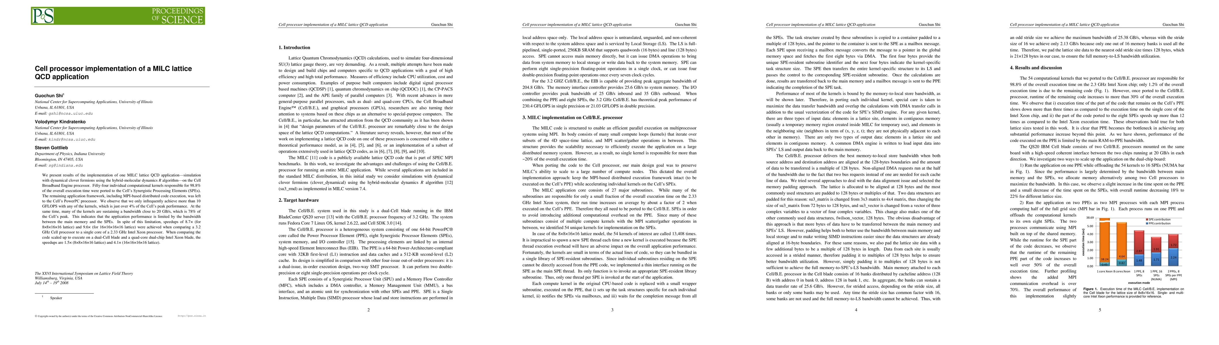 The implementation and analysis of a full MILC lattice QCD application on the Cell/B.E. processor, preserving the MPI-based distributed execution framework while accelerating individual kernels on SPEs.