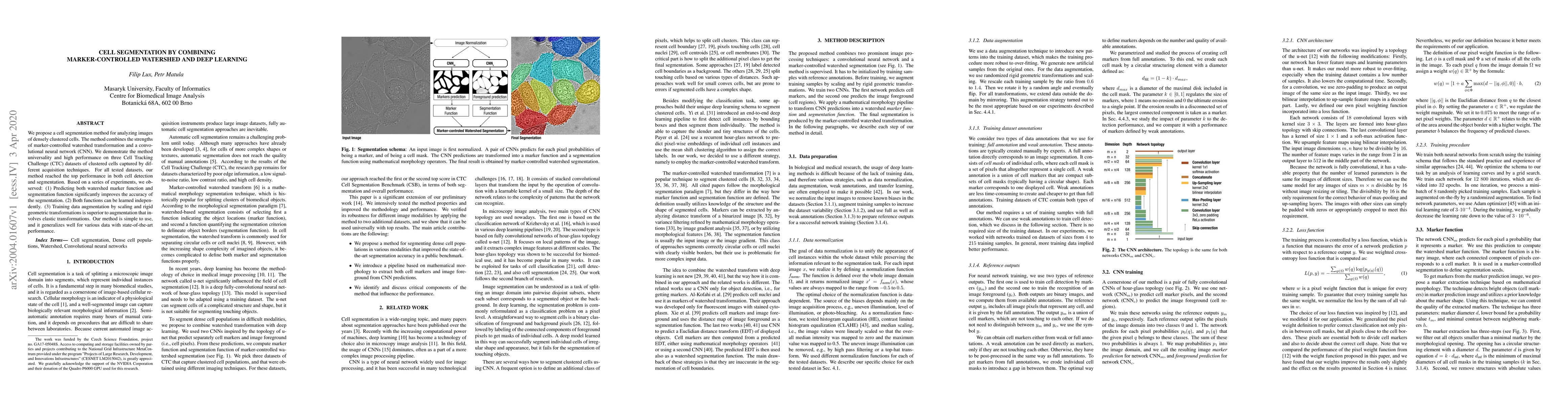 This paper presents a cell segmentation method that merges marker-controlled watershed transformation with deep learning, achieving top performance on three Cell Tracking Challenge datasets. The method's success is attributed to the combined prediction of both watershed marker and segmentation functions, with data augmentation via scaling and rigid transformations proving most effective.