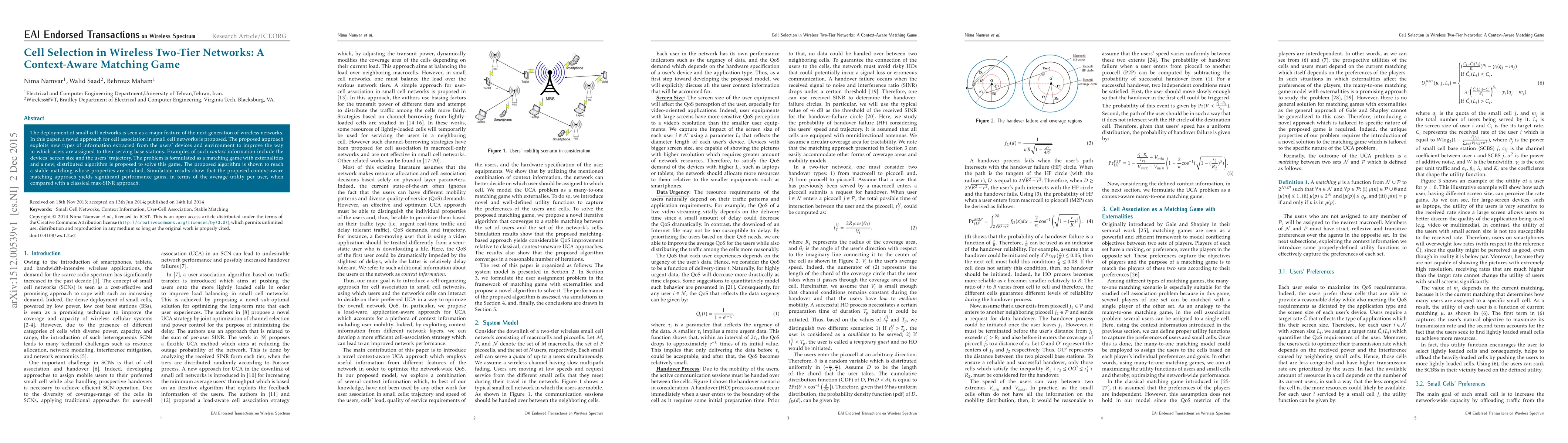 This paper proposes a novel context-aware matching game for cell selection in small cell networks, leveraging user device and environmental context information to improve base station association. A distributed algorithm is developed to solve the matching game, demonstrating significant performance gains over traditional methods.