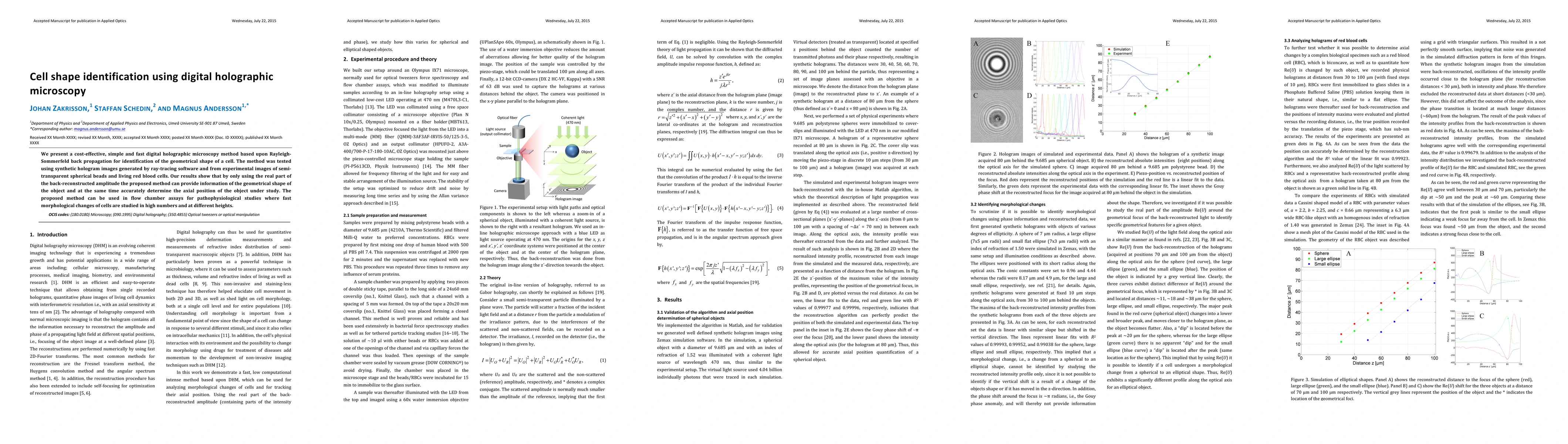 This paper introduces a cost-effective digital holographic microscopy method for identifying cell shapes using Rayleigh-Sommerfeld back propagation. The method successfully determines geometrical shapes and axial positions from real-part reconstructions, validated with synthetic and experimental images.