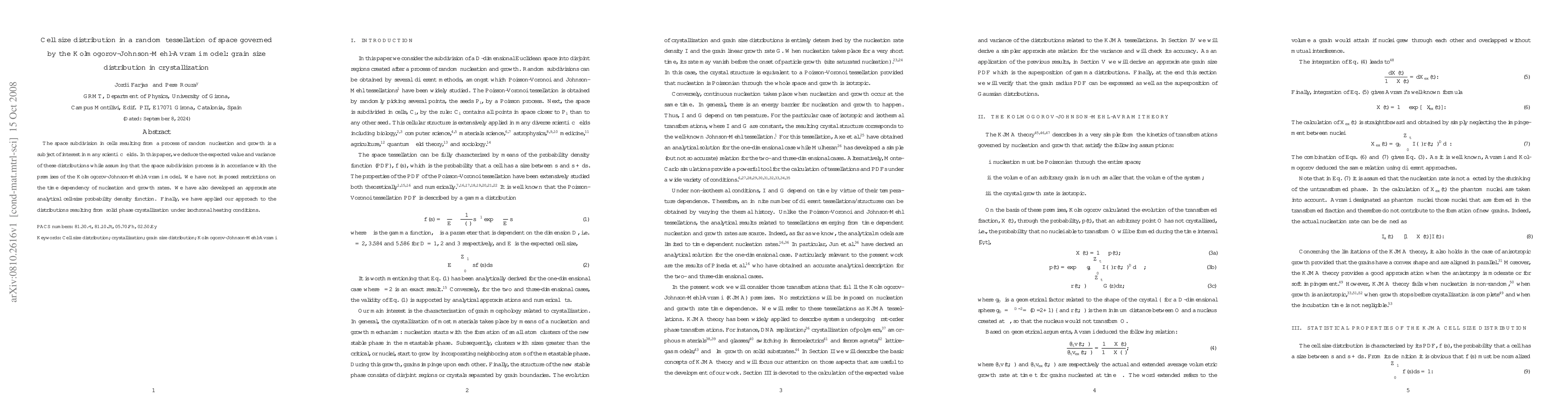 This paper analyzes the cell size distribution in a random tessellation of space following the Kolmogorov-Johnson-Mehl-Avrami model, deriving the expected value and variance of these distributions. An approximate analytical cell size probability density function is developed and applied to solid phase crystallization under isochronal heating conditions.