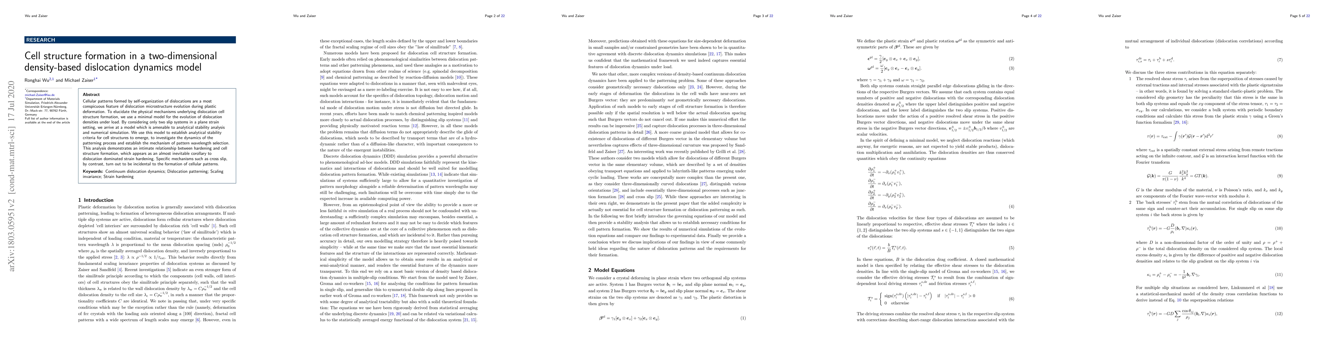 This paper investigates the formation of cellular patterns in dislocation microstructures through a density-based dislocation dynamics model, revealing a strong link between strain hardening and cell structure emergence, while showing that mechanisms like cross slip are not essential for pattern formation. Analytical stability criteria and numerical simulations elucidate the dynamics and wavelength selection of these patterns.