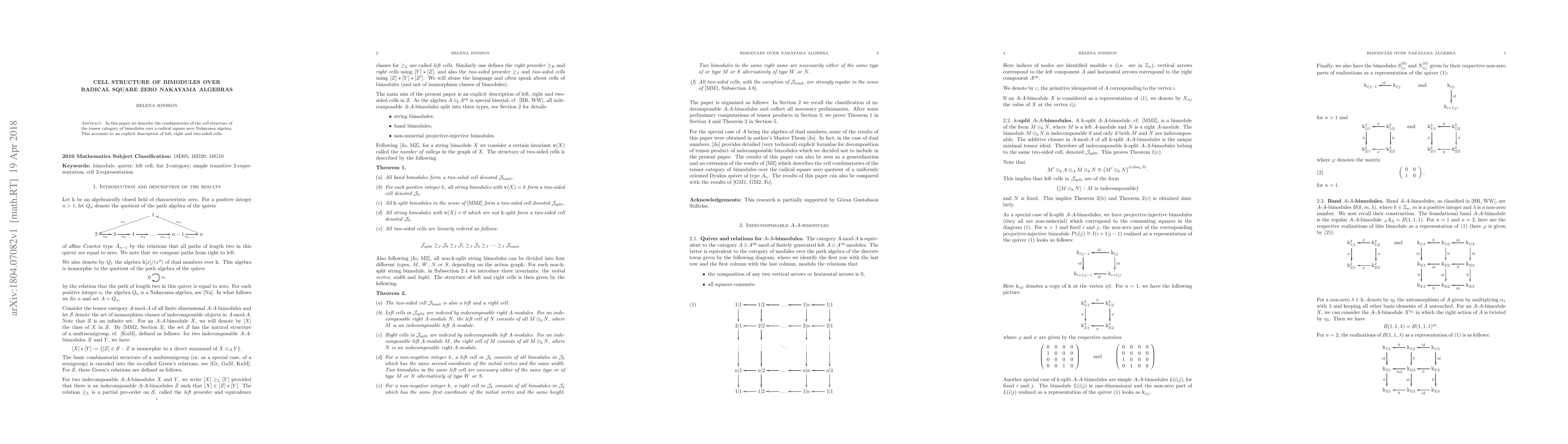 Summary: This research delineates the combinatorial cell structure of the tensor category of bimodules over radical square zero Nakayama algebras, providing an explicit account of left, right, and two-sided cells.