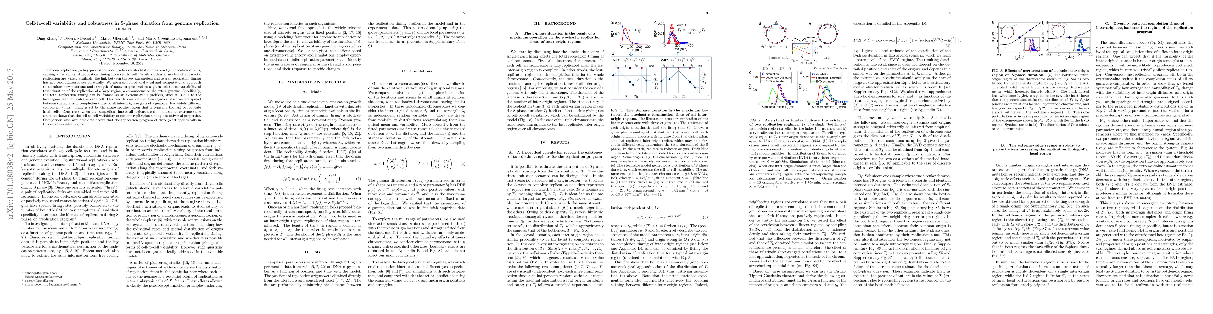 Genome replication, a key process for a cell, relies on stochastic initiation by replication origins, causing a variability of replication timing from cell to cell. While stochastic models of eukaryotic replication are widely available, the link between the key parameters and overall replication timing has not been addressed systematically.We use a combined analytical and computational approach to calculate how positions and strength of many origins lead to a given cell-to-cell variability of total duration of the replication of a large region, a chromosome or the entire genome.Specifically, the total replication timing can be framed as an extreme-value problem, since it is due to the last region that replicates in each cell. Our calculations identify two regimes based on the spread between characteristic completion times of all inter-origin regions of a genome. For widely different completion times, timing is set by the single specific region that is typically the last to replicate in all cells. Conversely, when the completion time of all regions are comparable,an extreme-value estimate shows that the cell-to-cell variability of genome replication timing has universal properties. Comparison with available data shows that the replication program of three yeast species falls in this extreme-value regime.