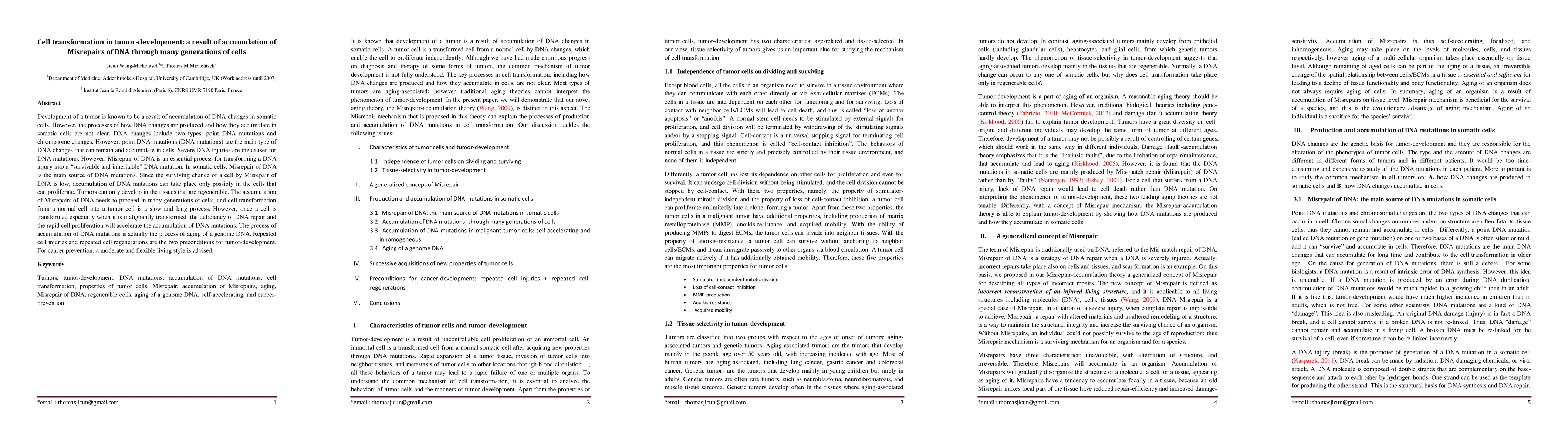 Development of a tumor is known to be a result of accumulation of DNA changes in somatic cells. However, the processes of how DNA changes are produced and how they accumulate in somatic cells are not clear. DNA changes include two types: point DNA mutations and chromosome changes. However, point DNA mutations (DNA mutations) are the main type of DNA changes that can remain and accumulate in cells. Severe DNA injuries are the causes for DNA mutations. However, Misrepair of DNA is an essential process for transforming a DNA injury into a survivable and inheritable DNA mutation. In somatic cells, Misrepair of DNA is the main source of DNA mutations. Since the surviving chance of a cell by Misrepair of DNA is low, accumulation of DNA mutations can take place only possibly in the cells that can proliferate. Tumors can only develop in the tissues that are regenerable. The accumulation of Misrepairs of DNA needs to proceed in many generations of cells, and cell transformation from a normal cell into a tumor cell is a slow and long process. However, once a cell is transformed especially when it is malignantly transformed, the deficiency of DNA repair and the rapid cell proliferation will accelerate the accumulation of DNA mutations. The process of accumulation of DNA mutations is actually the process of aging of a genome DNA. Repeated cell injuries and repeated cell regenerations are the two preconditions for tumor-development. For cancer prevention, a moderate and flexible living style is advised.