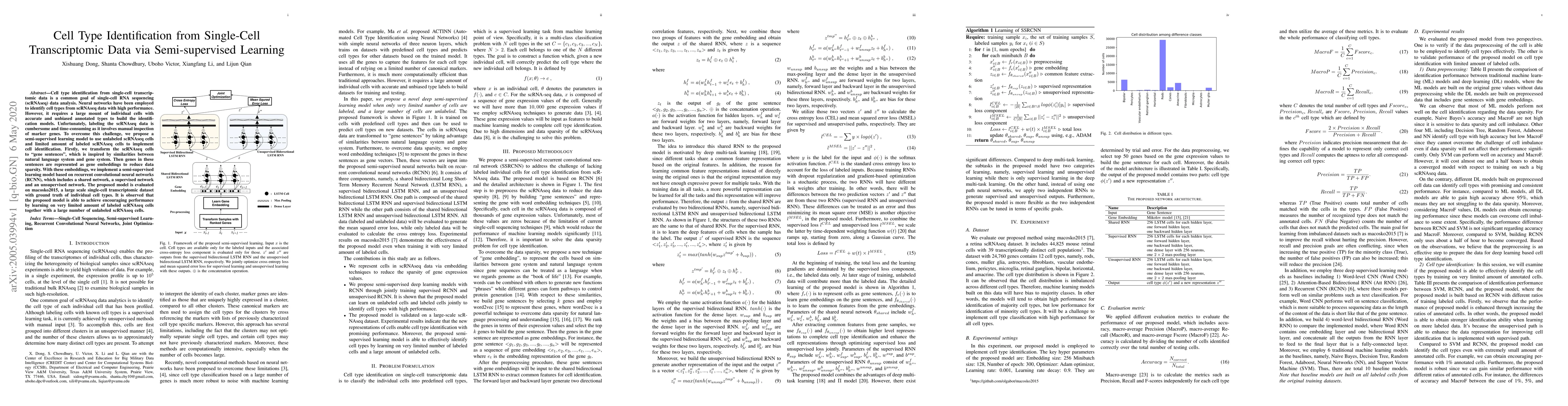 Cell type identification from single-cell transcriptomic data is a common goal of single-cell RNA sequencing (scRNAseq) data analysis. Neural networks have been employed to identify cell types from scRNAseq data with high performance. However, it requires a large mount of individual cells with accurate and unbiased annotated types to build the identification models. Unfortunately, labeling the scRNAseq data is cumbersome and time-consuming as it involves manual inspection of marker genes. To overcome this challenge, we propose a semi-supervised learning model to use unlabeled scRNAseq cells and limited amount of labeled scRNAseq cells to implement cell identification. Firstly, we transform the scRNAseq cells to "gene sentences", which is inspired by similarities between natural language system and gene system. Then genes in these sentences are represented as gene embeddings to reduce data sparsity. With these embeddings, we implement a semi-supervised learning model based on recurrent convolutional neural networks (RCNN), which includes a shared network, a supervised network and an unsupervised network. The proposed model is evaluated on macosko2015, a large scale single-cell transcriptomic dataset with ground truth of individual cell types. It is observed that the proposed model is able to achieve encouraging performance by learning on very limited amount of labeled scRNAseq cells together with a large number of unlabeled scRNAseq cells.