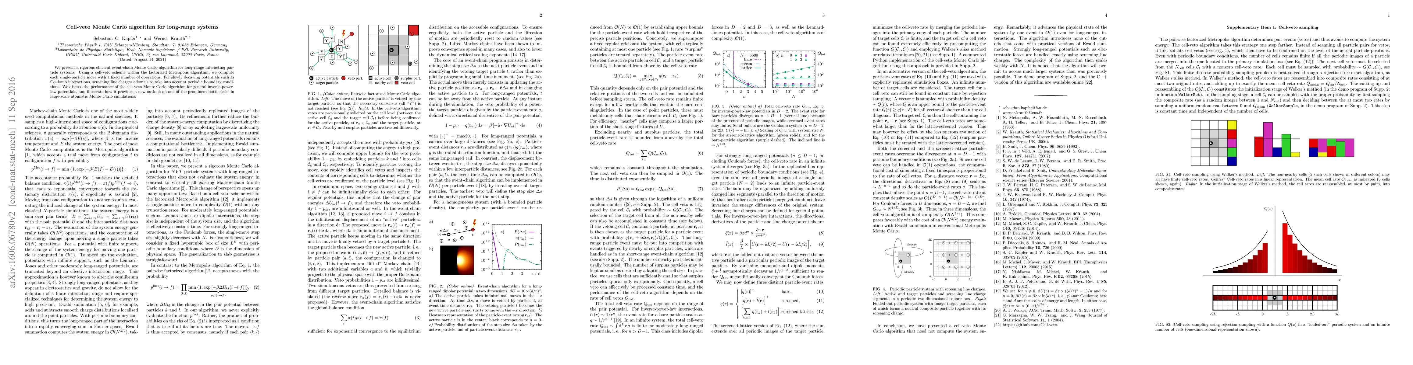 This paper introduces a cell-veto Monte Carlo algorithm for efficiently simulating long-range interactions in particle systems, achieving a fixed number of operations per move, and addressing challenges posed by slowly decaying potentials like Coulomb interactions. The method offers a significant improvement over traditional approaches in large-scale atomistic simulations.