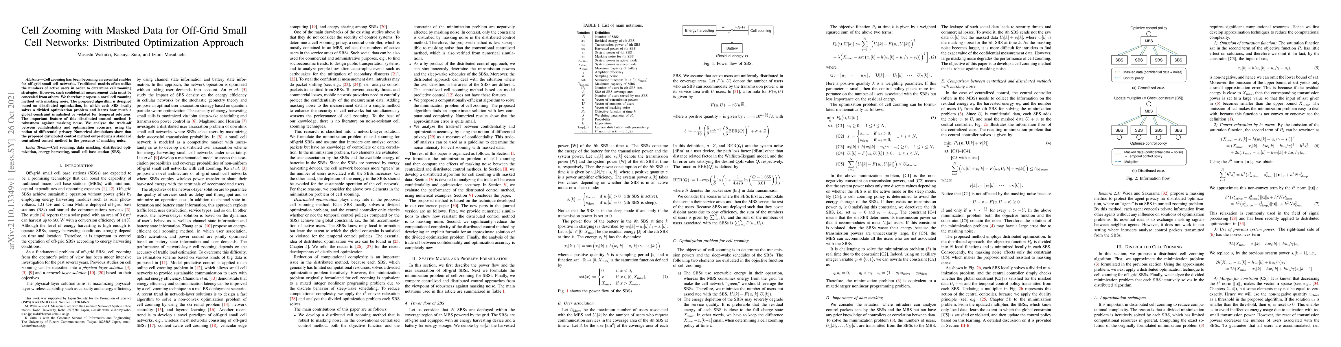 Cell zooming has been becoming an essential enabler for off-grid small cell networks. Traditional models often utilize the numbers of active users in order to determine cell zooming strategies. However, such confidential measurement data must be concealed from others. We therefore propose a novel cell zooming method with masking noise. The proposed algorithm is designed based on distributed optimization, in which each SBS locally solves a divided optimization problem and learns how much a global constraint is satisfied or violated for temporal solutions. The important feature of this distributed control method is robustness against masking noise. We analyze the trade-off between confidentiality and optimization accuracy, using the notion of differential privacy. Numerical simulations show that the proposed distributed control method outperforms a standard centralized control method in the presence of masking noise.