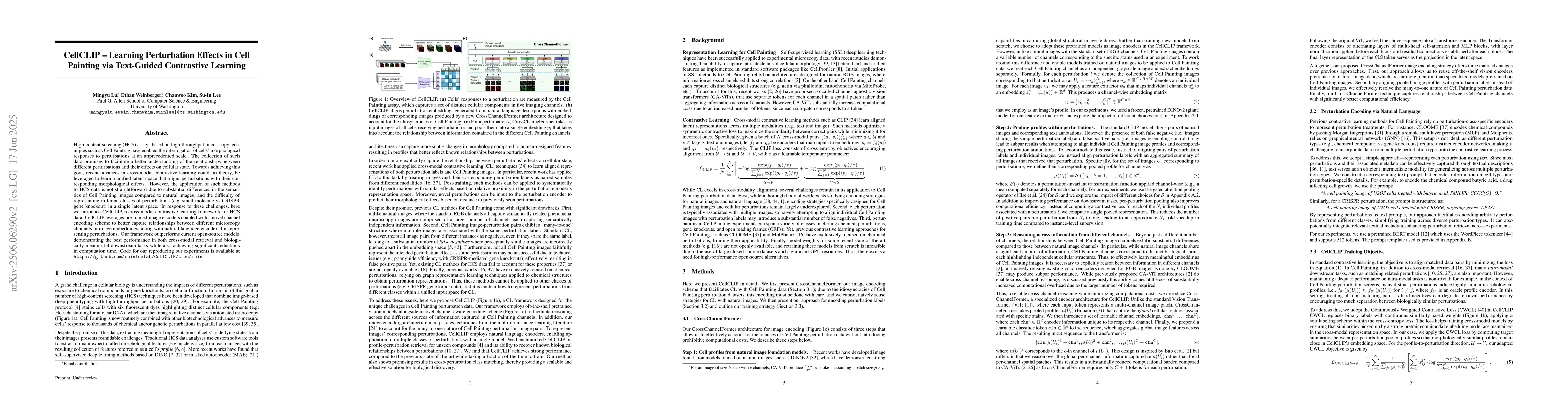 High-content screening (HCS) assays based on high-throughput microscopy techniques such as Cell Painting have enabled the interrogation of cells' morphological responses to perturbations at an unprecedented scale. The collection of such data promises to facilitate a better understanding of the relationships between different perturbations and their effects on cellular state. Towards achieving this goal, recent advances in cross-modal contrastive learning could, in theory, be leveraged to learn a unified latent space that aligns perturbations with their corresponding morphological effects. However, the application of such methods to HCS data is not straightforward due to substantial differences in the semantics of Cell Painting images compared to natural images, and the difficulty of representing different classes of perturbations (e.g., small molecule vs CRISPR gene knockout) in a single latent space. In response to these challenges, here we introduce CellCLIP, a cross-modal contrastive learning framework for HCS data. CellCLIP leverages pre-trained image encoders coupled with a novel channel encoding scheme to better capture relationships between different microscopy channels in image embeddings, along with natural language encoders for representing perturbations. Our framework outperforms current open-source models, demonstrating the best performance in both cross-modal retrieval and biologically meaningful downstream tasks while also achieving significant reductions in computation time.