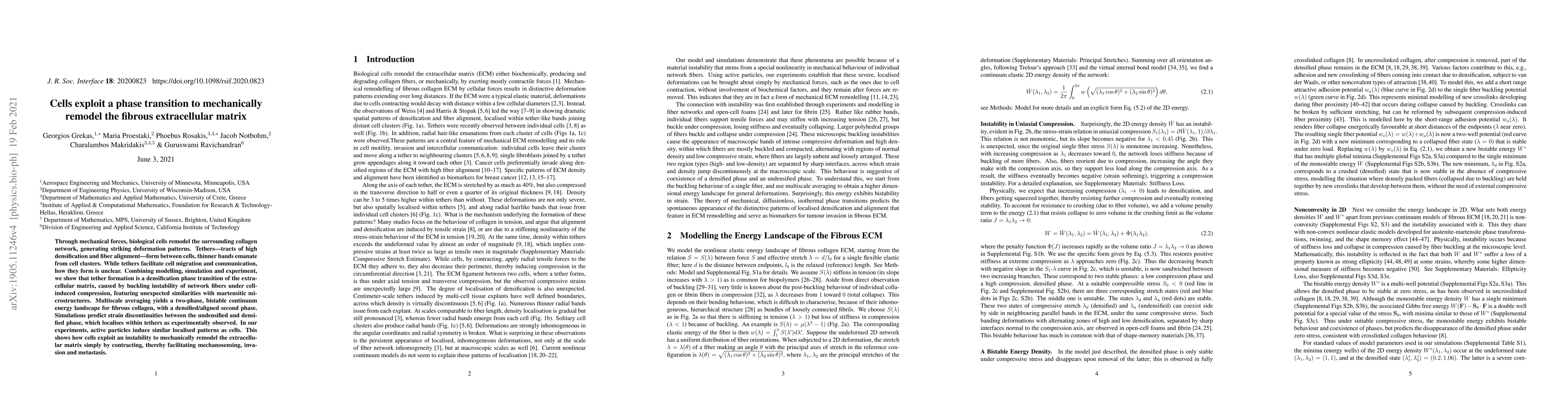 This paper demonstrates that cells induce a phase transition in the extracellular matrix, leading to the formation of tethers through buckling instability under compression, which facilitates cell migration and communication. Experiments, simulations, and modeling reveal that this process is akin to martensitic microstructures, highlighting the matrix's bistable nature and the role of mechanical forces in cellular remodeling.