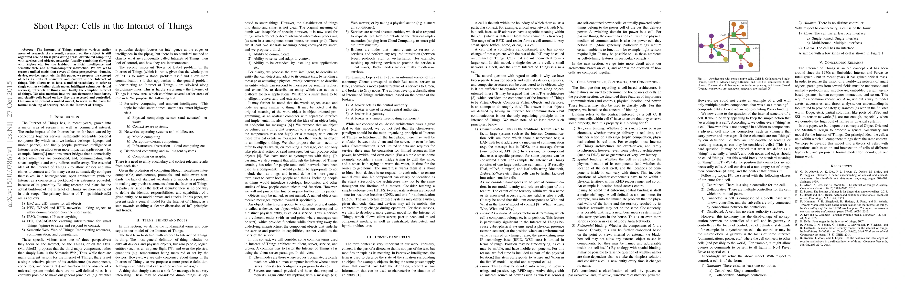 This paper introduces the concept of "cells" as a unified framework for structuring and contextualizing entities in the Internet of Things, encompassing various existing research areas like distributed computing, networks, AI, and human-computer interaction. The paper proposes criteria for defining cell boundaries and suggests its potential use as a foundational model for the IoT.