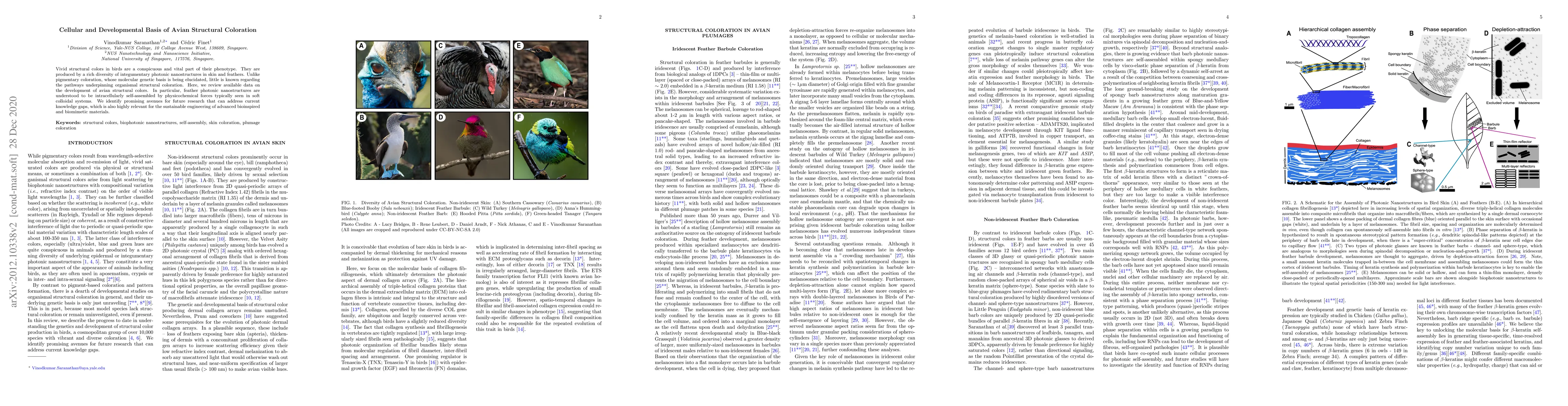 Vivid structural colors in birds are a conspicuous and vital part of their phenotype. They are produced by a rich diversity of integumentary photonic nanostructures in skin and feathers. Unlike pigmentary coloration, whose molecular genetic basis is being elucidated, little is known regarding the pathways underpinning organismal structural coloration. Here, we review available data on the development of avian structural colors. In particular, feather photonic nanostructures are understood to be intracellularly self-assembled by physicochemical forces typically seen in soft colloidal systems. We identify promising avenues for future research that can address current knowledge gaps, which is also highly relevant for the sustainable engineering of advanced bioinspired and biomimetic materials.
