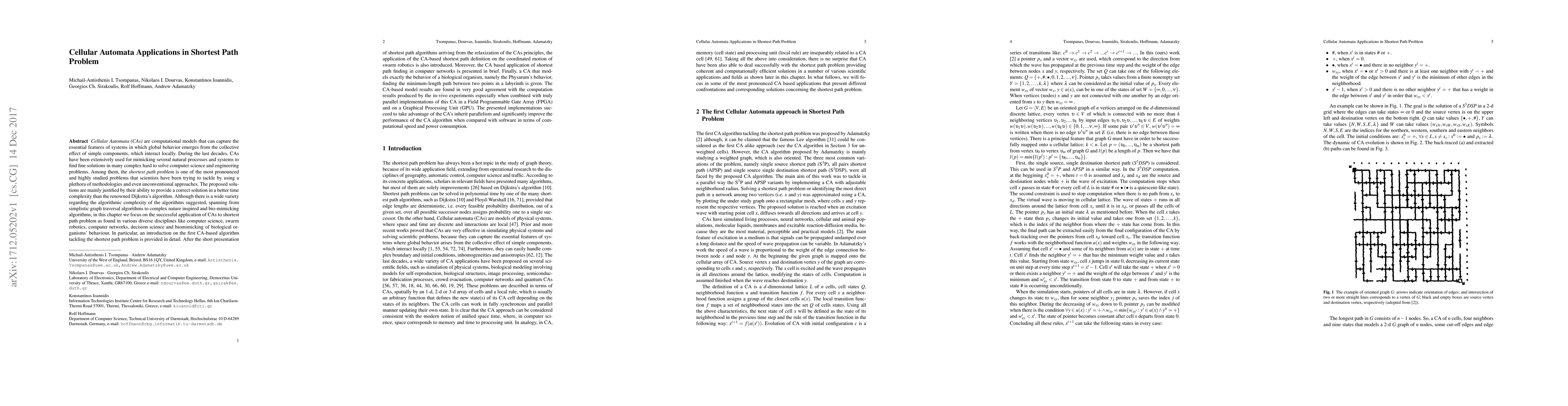 This paper explores the application of Cellular Automata (CAs) to solve the shortest path problem across various fields, highlighting their efficiency over traditional algorithms like Dijkstra's. It details the first CA-based algorithm, its use in swarm robotics, computer networks, and bio-mimicking of biological organisms like Physarum.