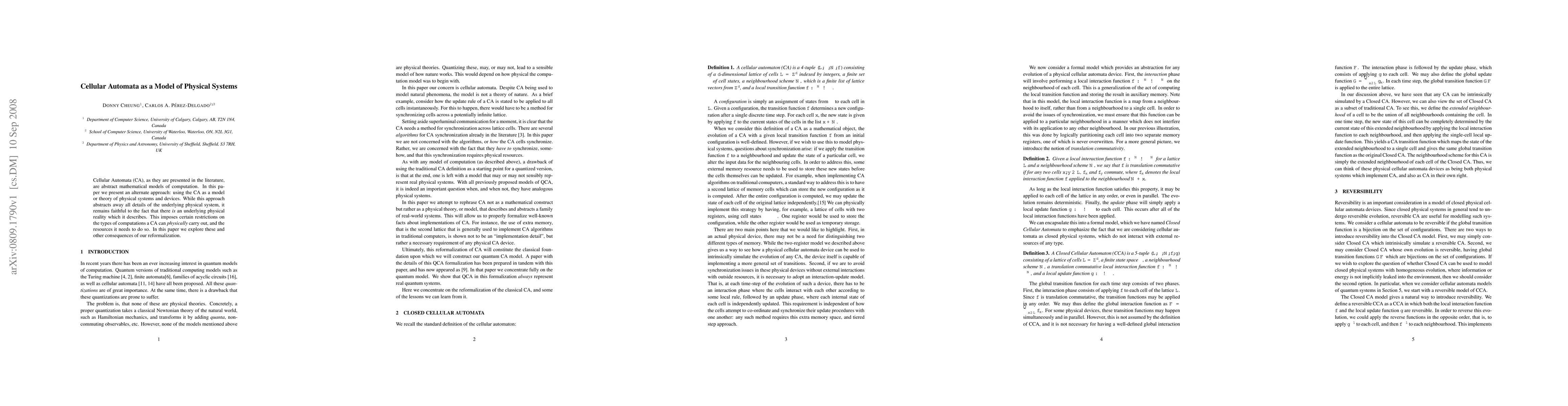 Cellular Automata (CA), as they are presented in the literature, are abstract mathematical models of computation. In this pa- per we present an alternate approach: using the CA as a model or theory of physical systems and devices. While this approach abstracts away all details of the underlying physical system, it remains faithful to the fact that there is an underlying physical reality which it describes. This imposes certain restrictions on the types of computations a CA can physically carry out, and the resources it needs to do so. In this paper we explore these and other consequences of our reformalization.