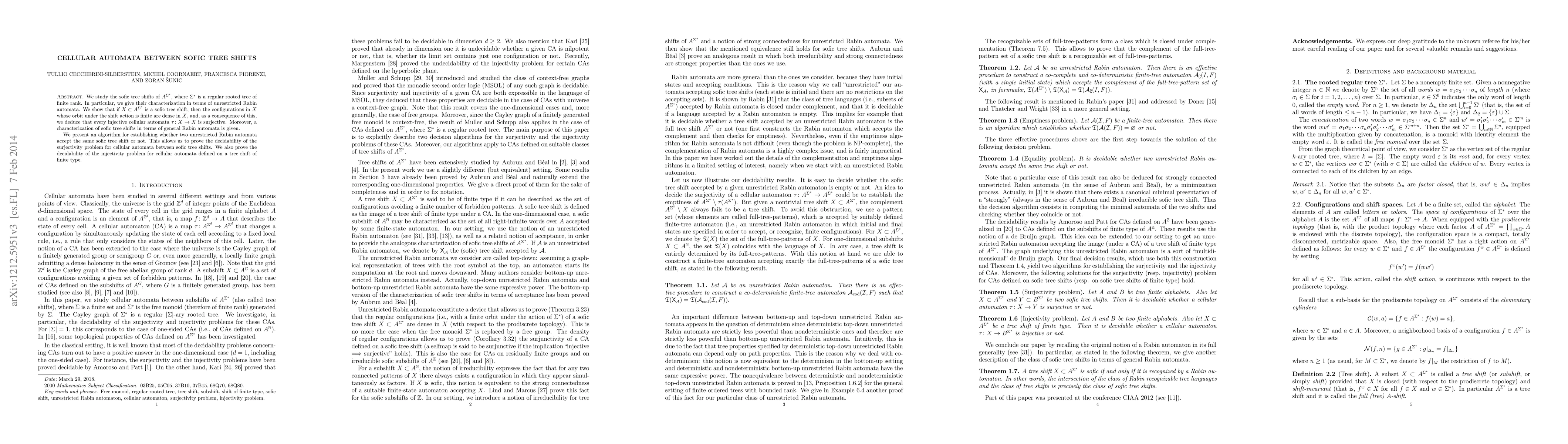 This paper characterizes sofic tree shifts using unrestricted Rabin automata and shows that finite orbits in these shifts are dense. It proves that injective cellular automata on sofic tree shifts are surjective and presents an algorithm for determining if two Rabin automata accept the same sofic tree shift, leading to decidability results for cellular automata between these shifts.