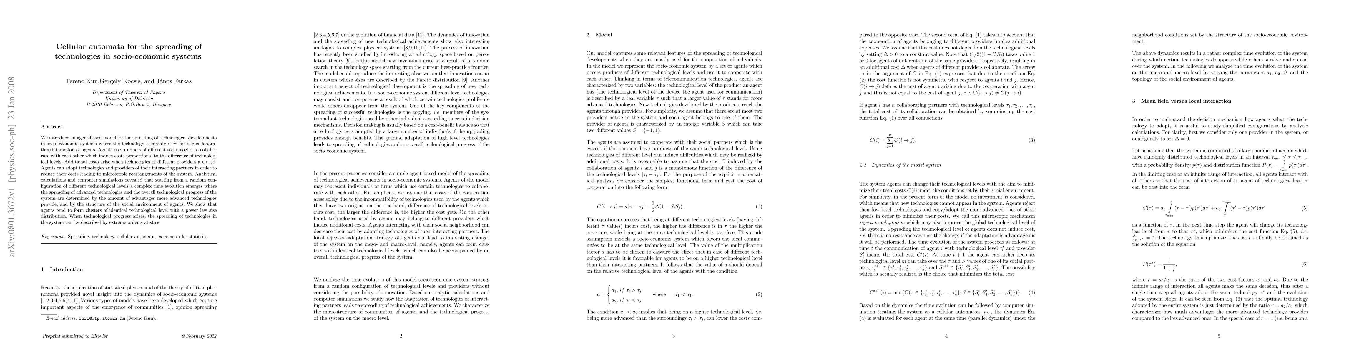 We introduce an agent-based model for the spreading of technological developments in socio-economic systems where the technology is mainly used for the collaboration/interaction of agents. Agents use products of different technologies to collaborate with each other which induce costs proportional to the difference of technological levels. Additional costs arise when technologies of different providers are used. Agents can adopt technologies and providers of their interacting partners in order to reduce their costs leading to microscopic rearrangements of the system. Analytical calculations and computer simulations revealed that starting from a random configuration of different technological levels a complex time evolution emerges where the spreading of advanced technologies and the overall technological progress of the system are determined by the amount of advantages more advanced technologies provide, and by the structure of the social environment of agents. We show that agents tend to form clusters of identical technological level with a power law size distribution. When technological progress arises, the spreading of technologies in the system can be described by extreme order statistics.