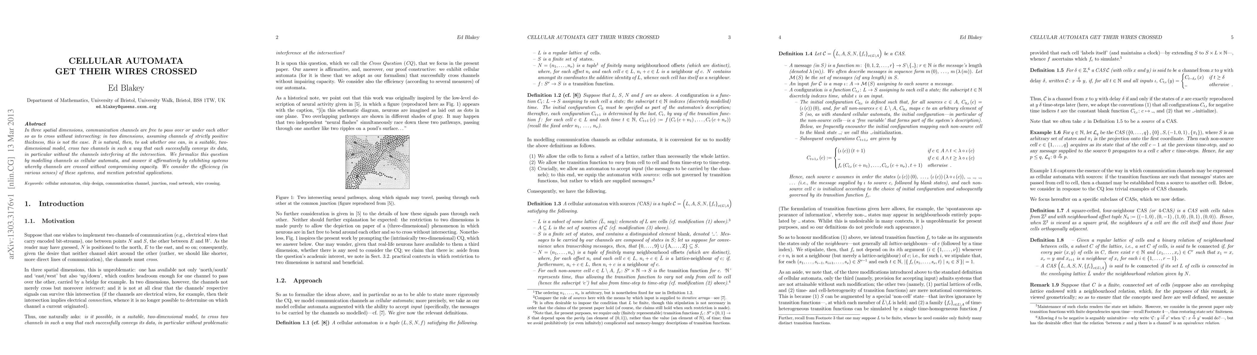 In three spatial dimensions, communication channels are free to pass over or under each other so as to cross without intersecting; in two dimensions, assuming channels of strictly positive thickness, this is not the case. It is natural, then, to ask whether one can, in a suitable, two-dimensional model, cross two channels in such a way that each successfully conveys its data, in particular without the channels interfering at the intersection. We formalize this question by modelling channels as cellular automata, and answer it affirmatively by exhibiting systems whereby channels are crossed without compromising capacity. We consider the efficiency (in various senses) of these systems, and mention potential applications.