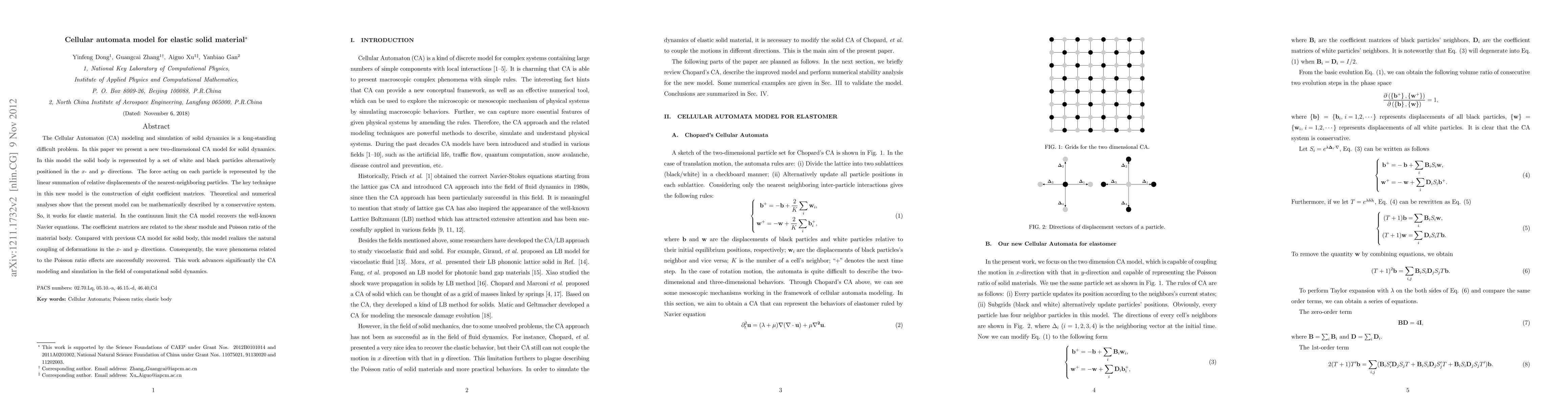 The Cellular Automaton (CA) modeling and simulation of solid dynamics is a long-standing difficult problem. In this paper we present a new two-dimensional CA model for solid dynamics. In this model the solid body is represented by a set of white and black particles alternatively positioned in the $x$- and $y$- directions. The force acting on each particle is represented by the linear summation of relative displacements of the nearest-neighboring particles. The key technique in this new model is the construction of eight coefficient matrices. Theoretical and numerical analyses show that the present model can be mathematically described by a conservative system. So, it works for elastic material. In the continuum limit the CA model recovers the well-known Navier equations. The coefficient matrices are related to the shear module and Poisson ratio of the material body. Compared with previous CA model for solid body, this model realizes the natural coupling of deformations in the $x$- and $y$- directions. Consequently, the wave phenomena related to the Poisson ratio effects are successfully recovered. This work advances significantly the CA modeling and simulation in the field of computational solid dynamics.