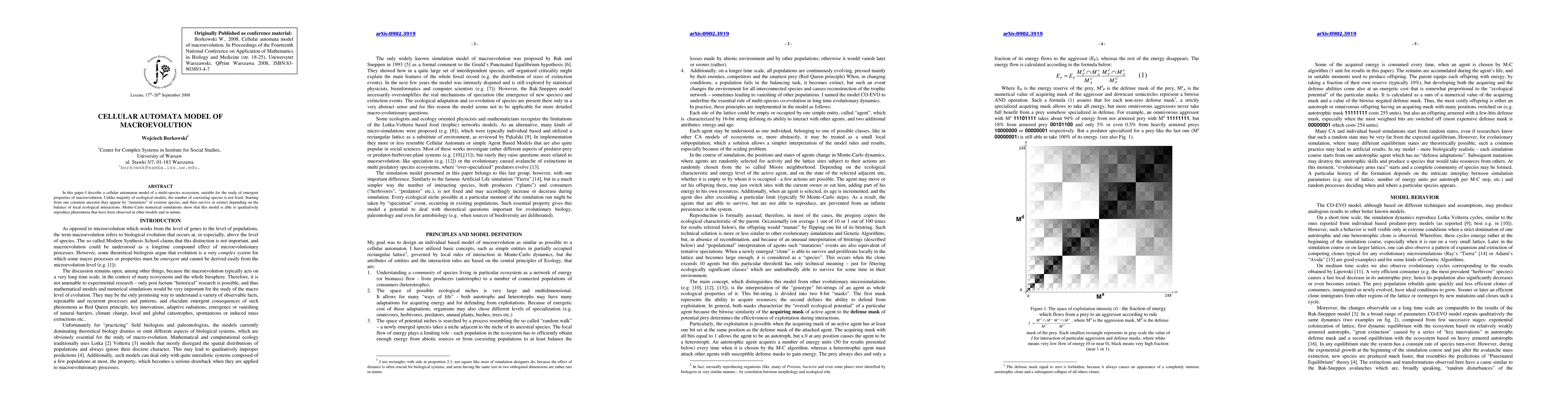 A cellular automaton model simulates macroevolution by having species emerge from a common ancestor through mutations, surviving or going extinct based on local ecological interactions. The model reproduces observed phenomena in nature and other models, providing insight into the emergence of life's diversity.