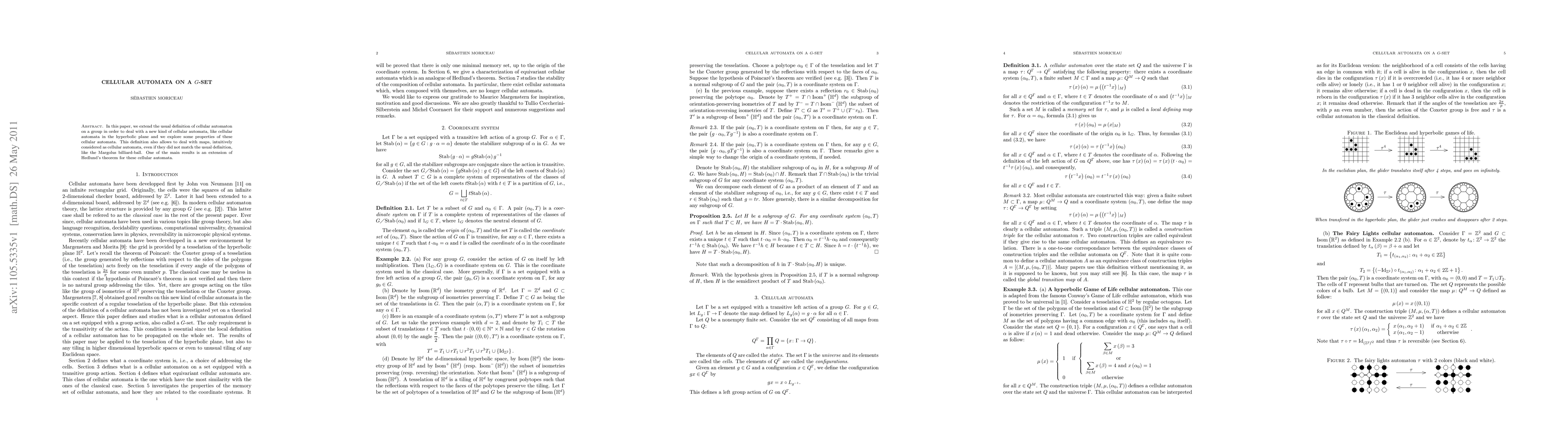This paper extends the concept of cellular automata on groups to $G$-sets, including examples like automata in hyperbolic planes and non-standard maps like the Margolus billiard-ball. It explores properties of these extended automata and extends Hedlund's theorem to this new framework.
