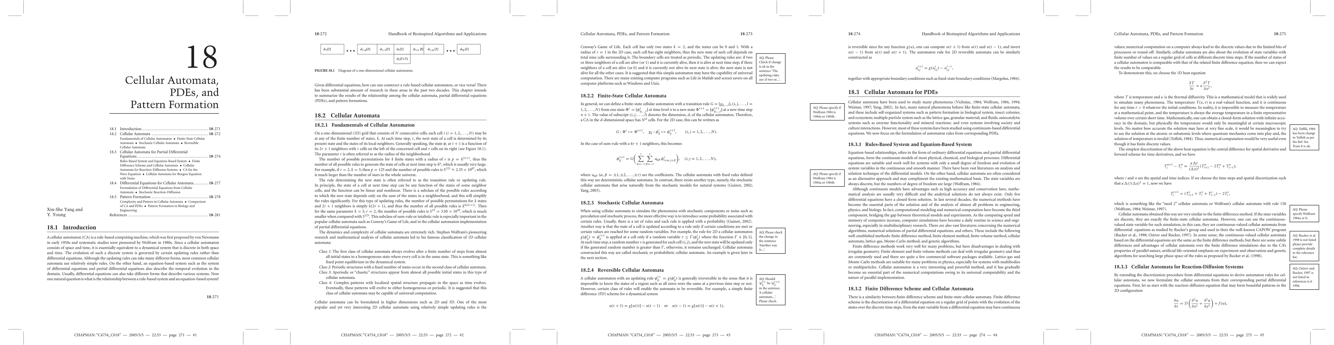 State-of-the-art review of cellular automata, cellular automata for partial differential equations, differential equations for cellular automata and pattern formation in biology and engineering.