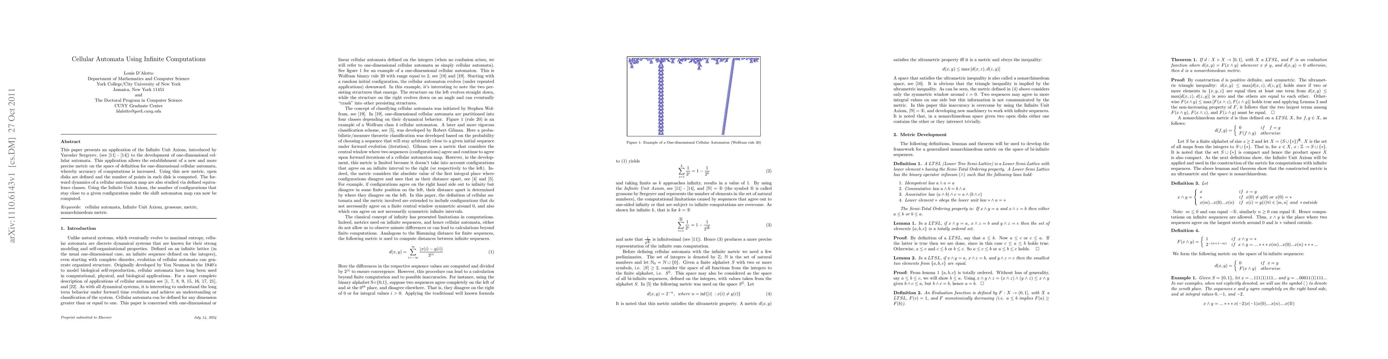 This paper applies the Infinite Unit Axiom to develop one-dimensional cellular automata, enhancing computation precision through a new metric. It computes the number of configurations near a given state and studies equivalence classes via forward dynamics.