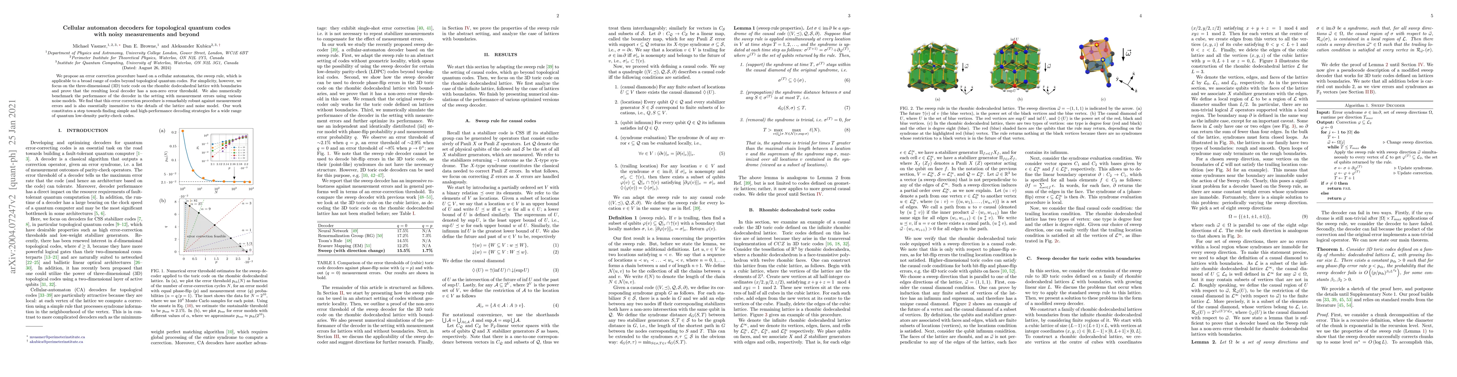 We propose an error correction procedure based on a cellular automaton, the sweep rule, which is applicable to a broad range of codes beyond topological quantum codes. For simplicity, however, we focus on the three-dimensional (3D) toric code on the rhombic dodecahedral lattice with boundaries and prove that the resulting local decoder has a non-zero error threshold. We also numerically benchmark the performance of the decoder in the setting with measurement errors using various noise models. We find that this error correction procedure is remarkably robust against measurement errors and is also essentially insensitive to the details of the lattice and noise model. Our work constitutes a step towards finding simple and high-performance decoding strategies for a wide range of quantum low-density parity-check codes.
