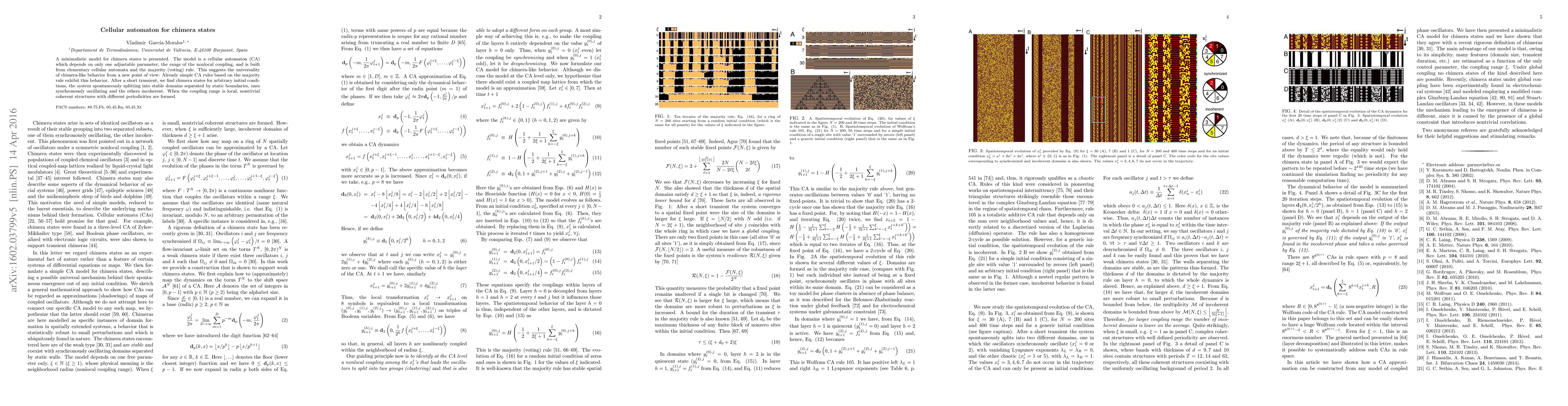 A minimalistic model for chimera states is presented. The model is a cellular automaton (CA) which depends on only one adjustable parameter, the range of the nonlocal coupling, and is built from elementary cellular automata and the majority (voting) rule. This suggests the universality of chimera-like behavior from a new point of view: Already simple CA rules based on the majority rule exhibit this behavior. After a short transient, we find chimera states for arbitrary initial conditions, the system spontaneously splitting into stable domains separated by static boundaries, ones synchronously oscillating and the others incoherent. When the coupling range is local, nontrivial coherent structures with different periodicities are formed.