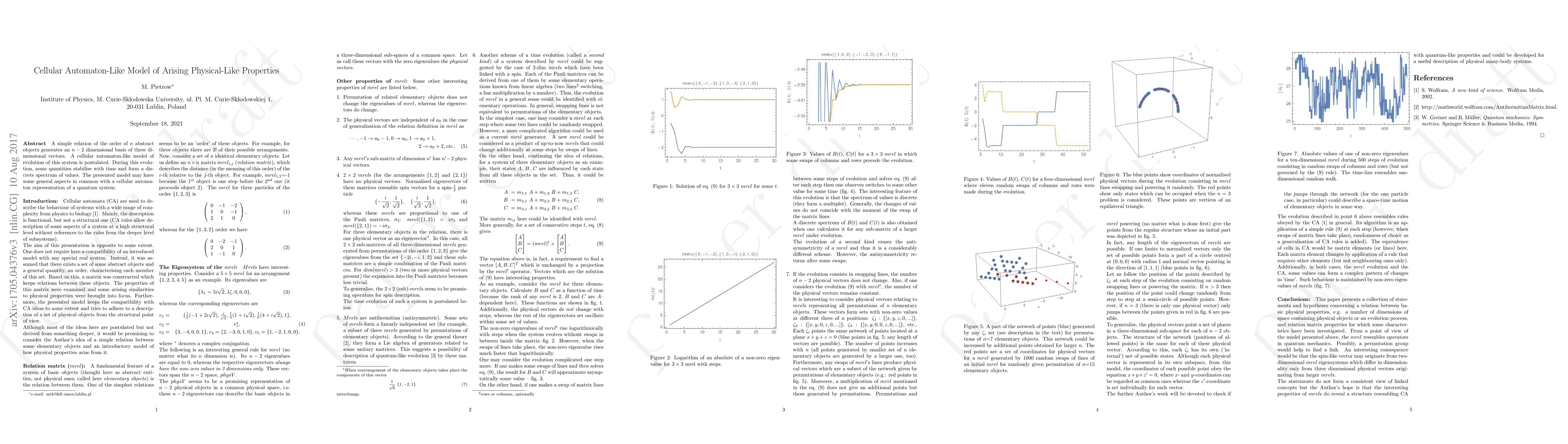 This paper proposes a cellular automaton-like model where an order of $n$ abstract objects generates an $n-2$ dimensional basis for three-dimensional vectors. The model evolves over time, stabilizing certain quantities into a discrete spectrum, potentially sharing general features with quantum systems.