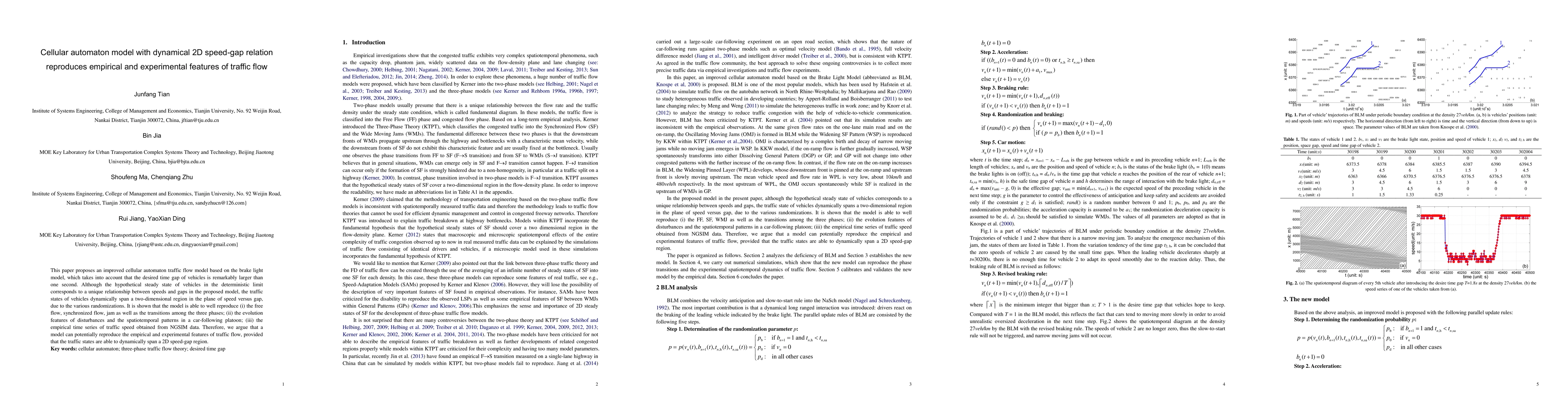 This paper proposes an improved cellular automaton traffic flow model based on the brake light model, which takes into account that the desired time gap of vehicles is remarkably larger than one second. Although the hypothetical steady state of vehicles in the deterministic limit corresponds to a unique relationship between speeds and gaps in the proposed model, the traffic states of vehicles dynamically span a two-dimensional region in the plane of speed versus gap, due to the various randomizations. It is shown that the model is able to well reproduce (i) the free flow, synchronized flow, jam as well as the transitions among the three phases; (ii) the evolution features of disturbances and the spatiotemporal patterns in a car-following platoon; (iii) the empirical time series of traffic speed obtained from NGSIM data. Therefore, we argue that a model can potentially reproduce the empirical and experimental features of traffic flow, provided that the traffic states are able to dynamically span a 2D speed-gap region.