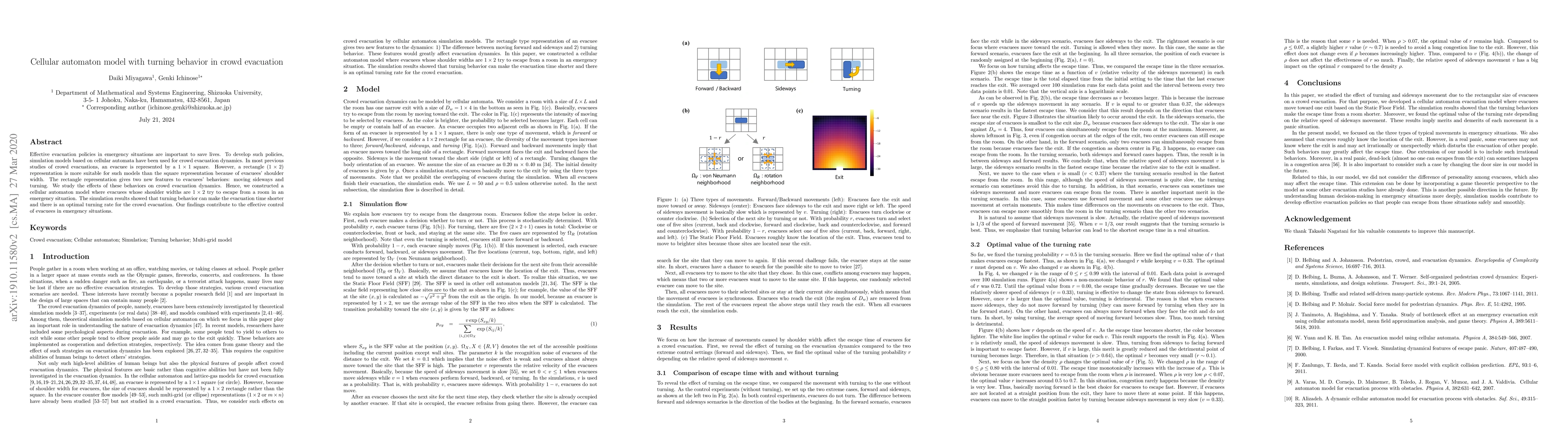This paper develops a cellular automaton model for crowd evacuation using a $1 \times 2$ rectangle representation to better reflect evacuees' shoulder width, incorporating sideways movement and turning behavior. Simulation results indicate that turning behavior can reduce evacuation time, with an optimal turning rate identified for effective emergency management.