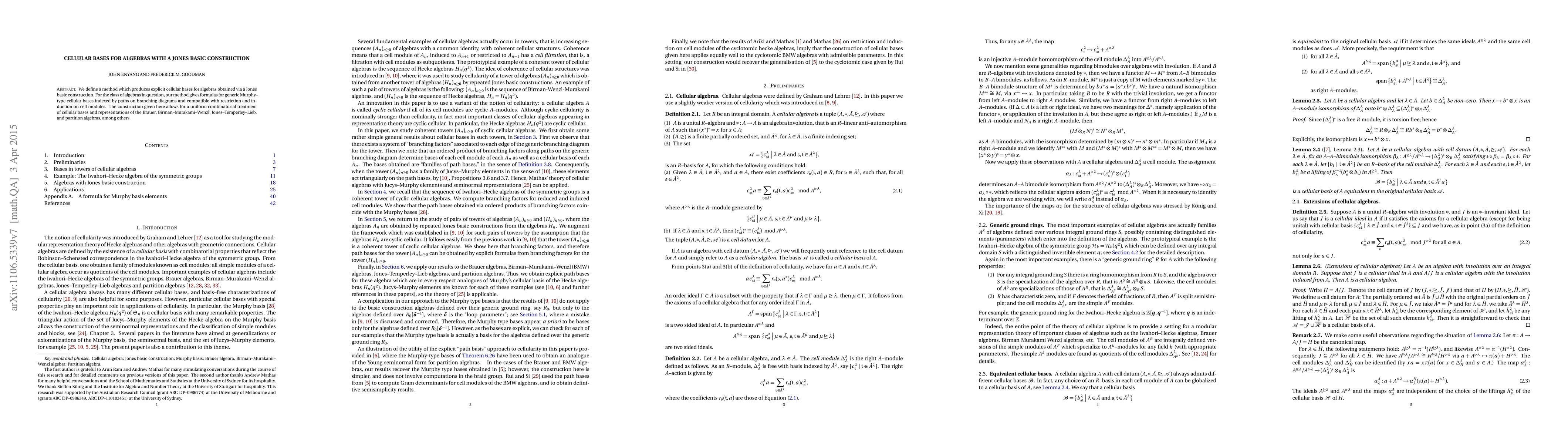We define a method which produces explicit cellular bases for algebras obtained via a Jones basic construction. For the class of algebras in question, our method gives formulas for generic Murphy--type cellular bases indexed by paths on branching diagrams and compatible with restriction and induction on cell modules. The construction given here allows for a uniform combinatorial treatment of cellular bases and representations of the Brauer, Birman-Murakami-Wenzl, Temperley-Lieb, and partition algebras, among others.
